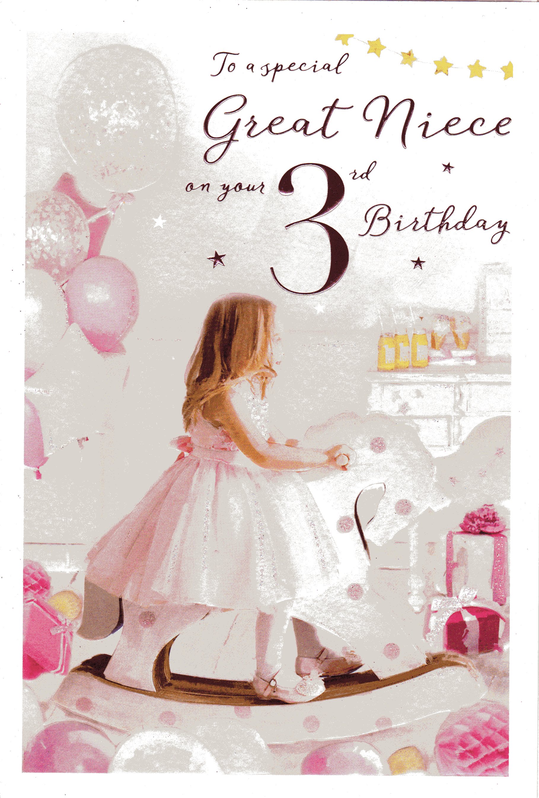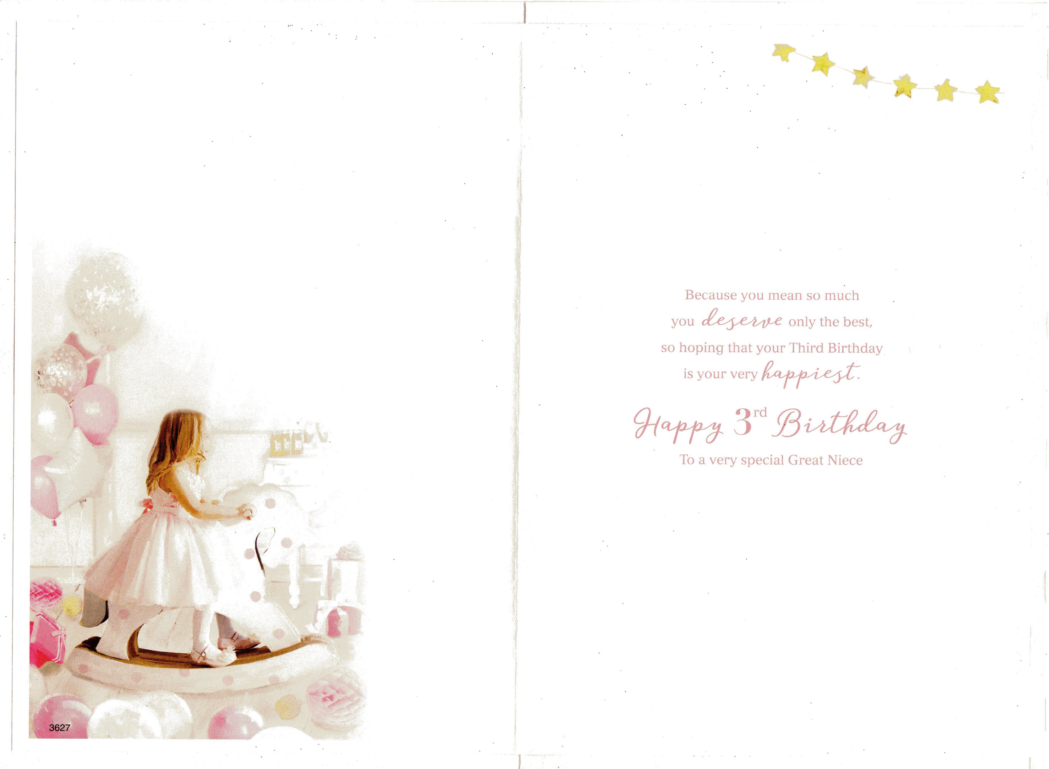 Inside reads: Because you mean so much you Deserve only the best, so hoping that your Third Birthday is your very happiest. Happy 3rd Birthday To a very special Great Niece.