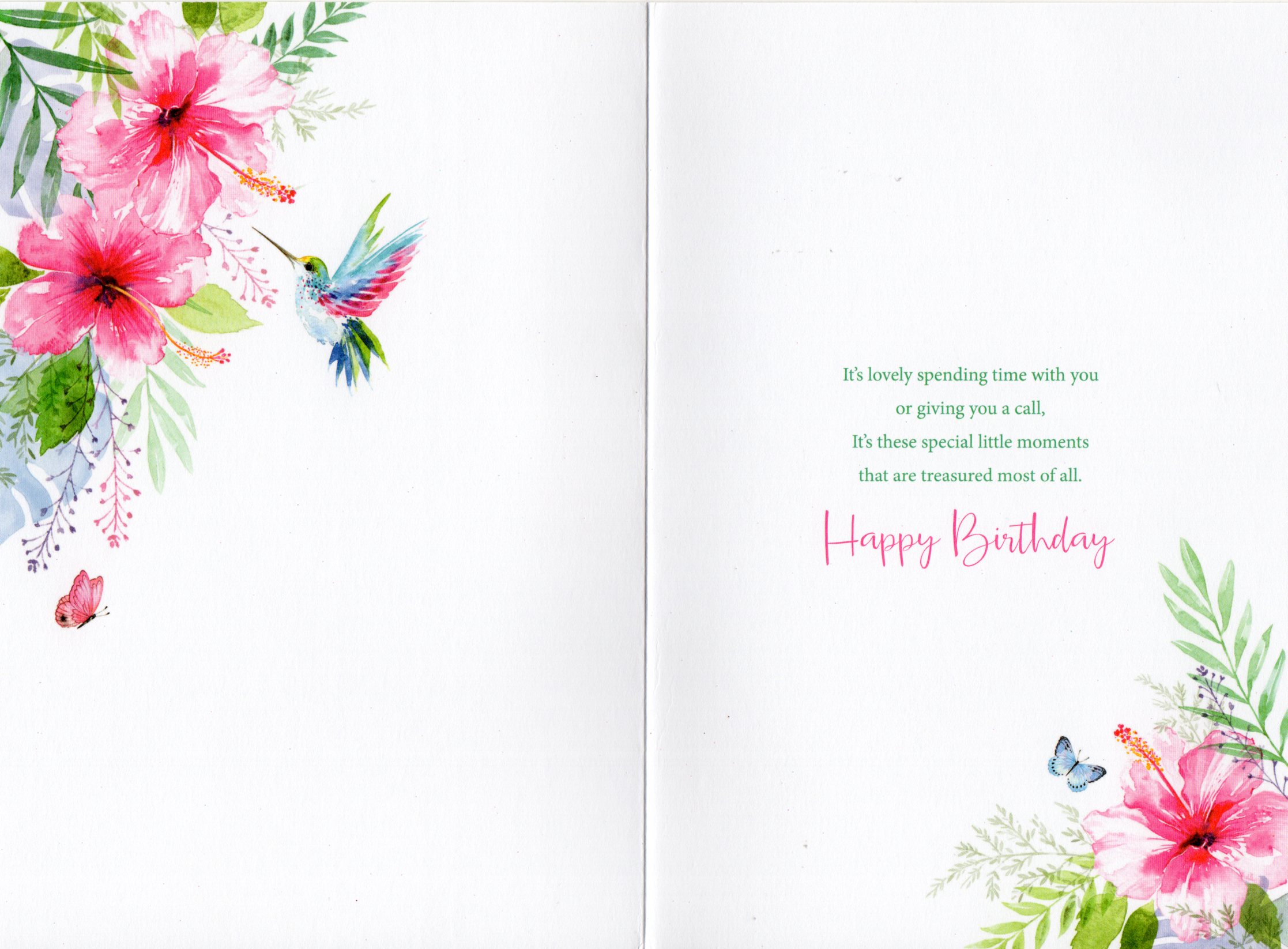 Inside reads: It's lovely spending time with you or giving you a call, It's these special little moments that are treasured most of all. Happy Birthday