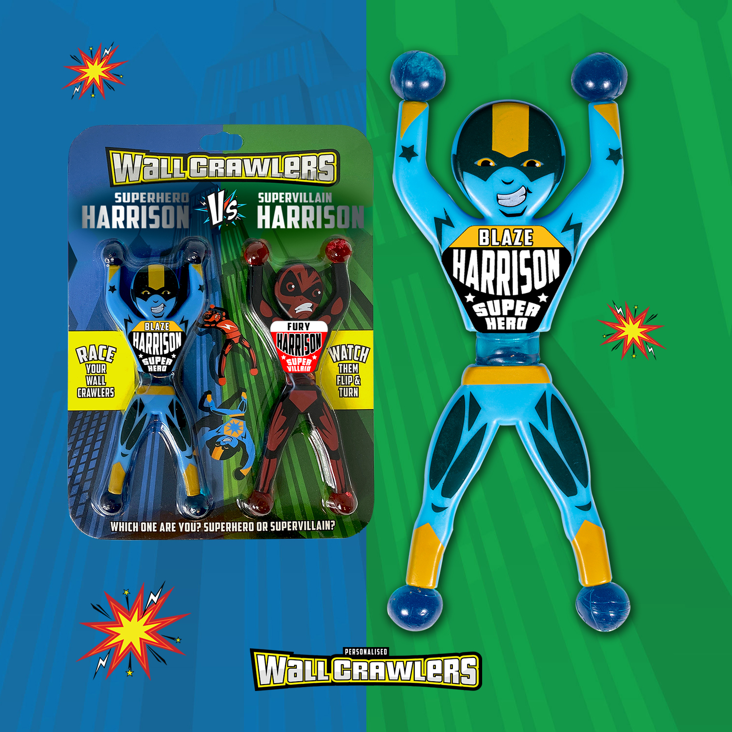 Throw your superhero and supervillain Wall Crawlers at a smooth vertical surface- try a wall, window or even bathroom tiles and see a super race in action!