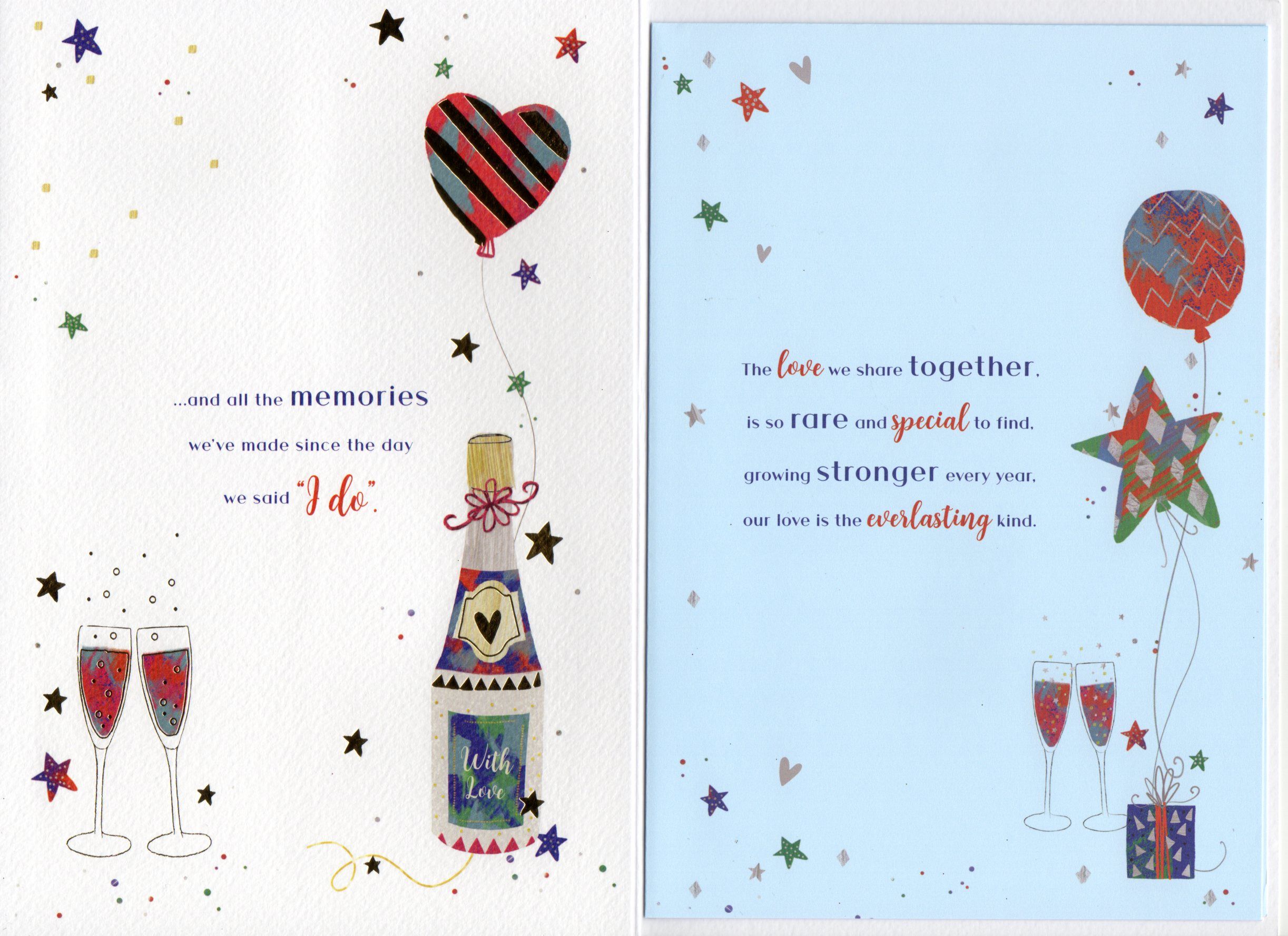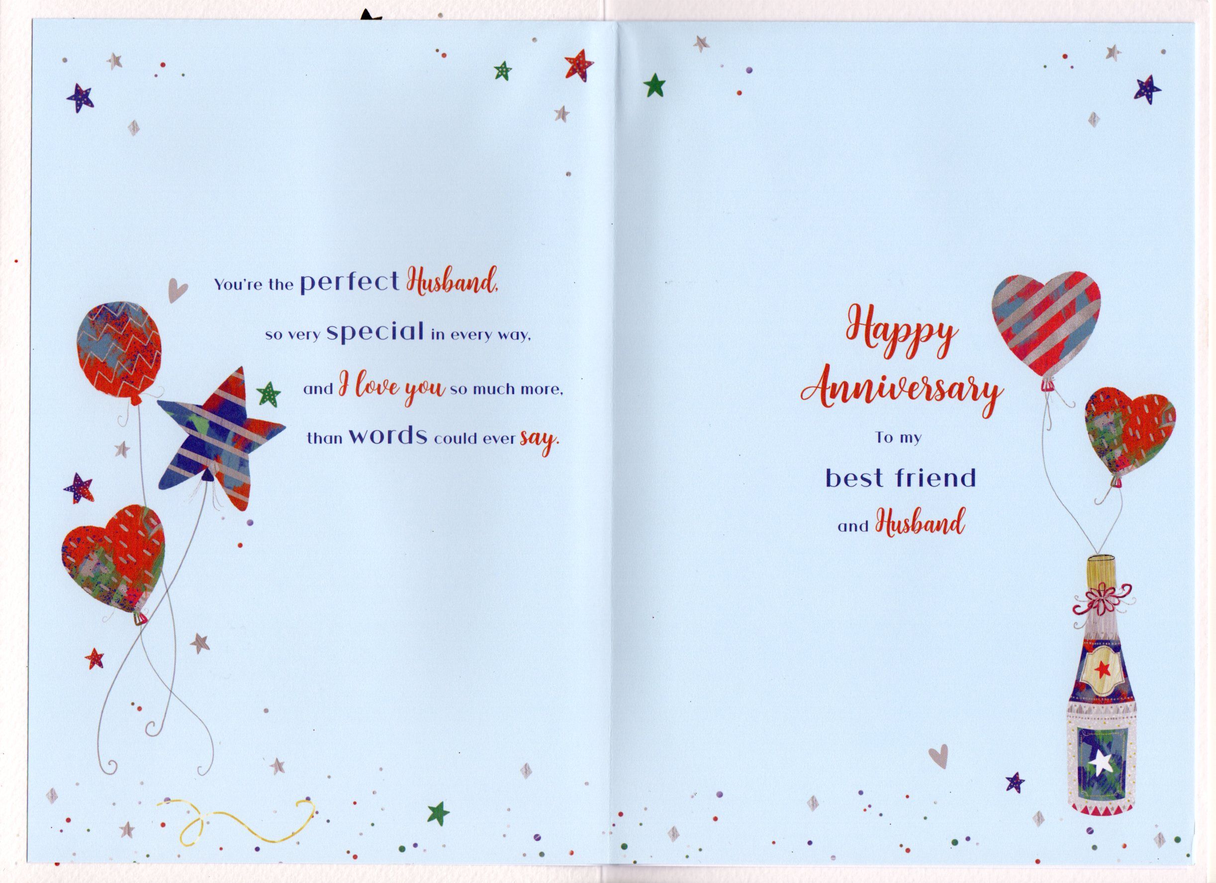 Inside reads: page l ...and all the memories we've made since the day we said ''I do'', the love we share together, is so rare and special to find, growing stronger every year, our love is the everlasting kind. page ll You're the perfect Husband, so very special in every way, and i love you so much more, than words could ever say. Happy Anniversary To my best friend and Husband