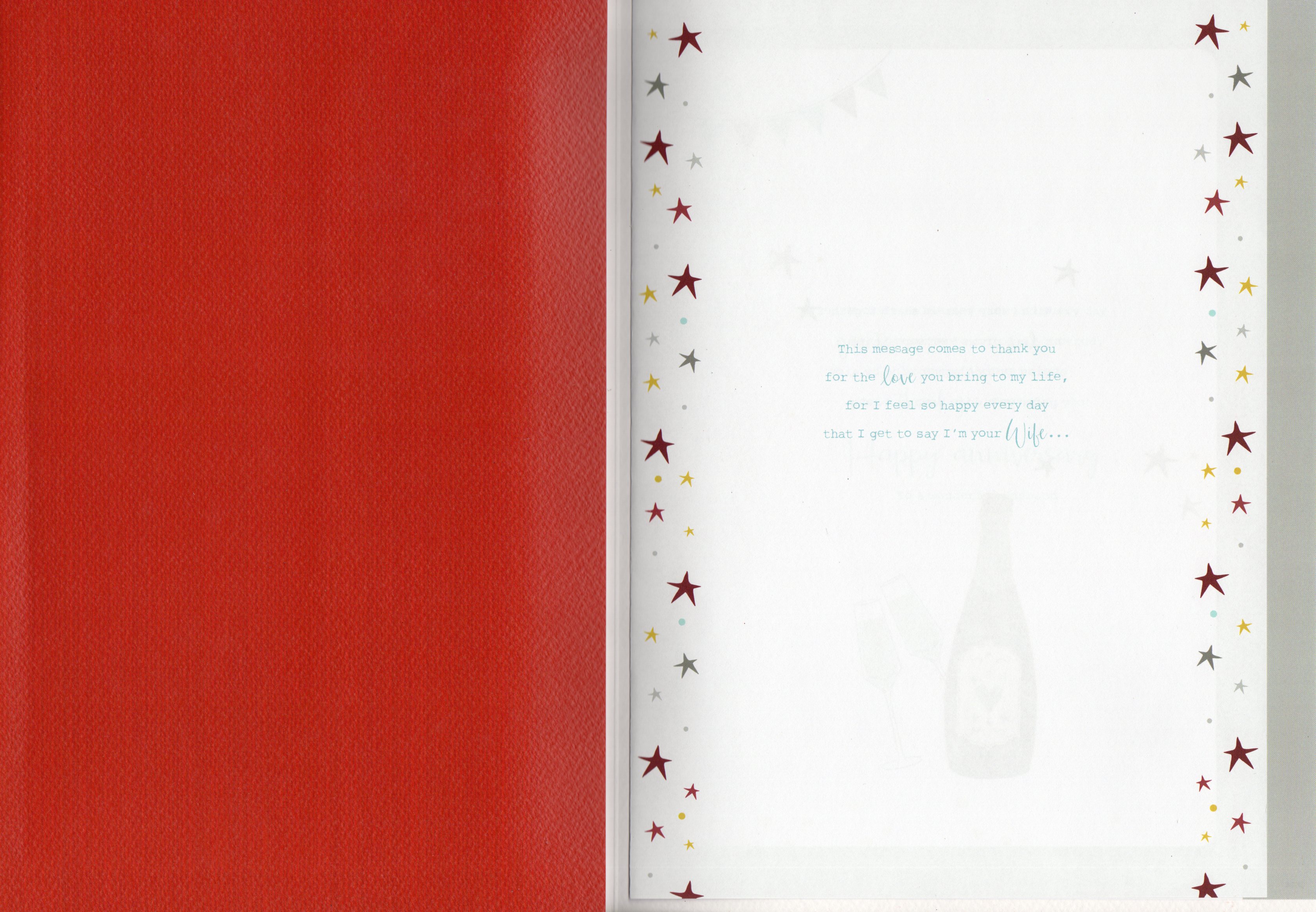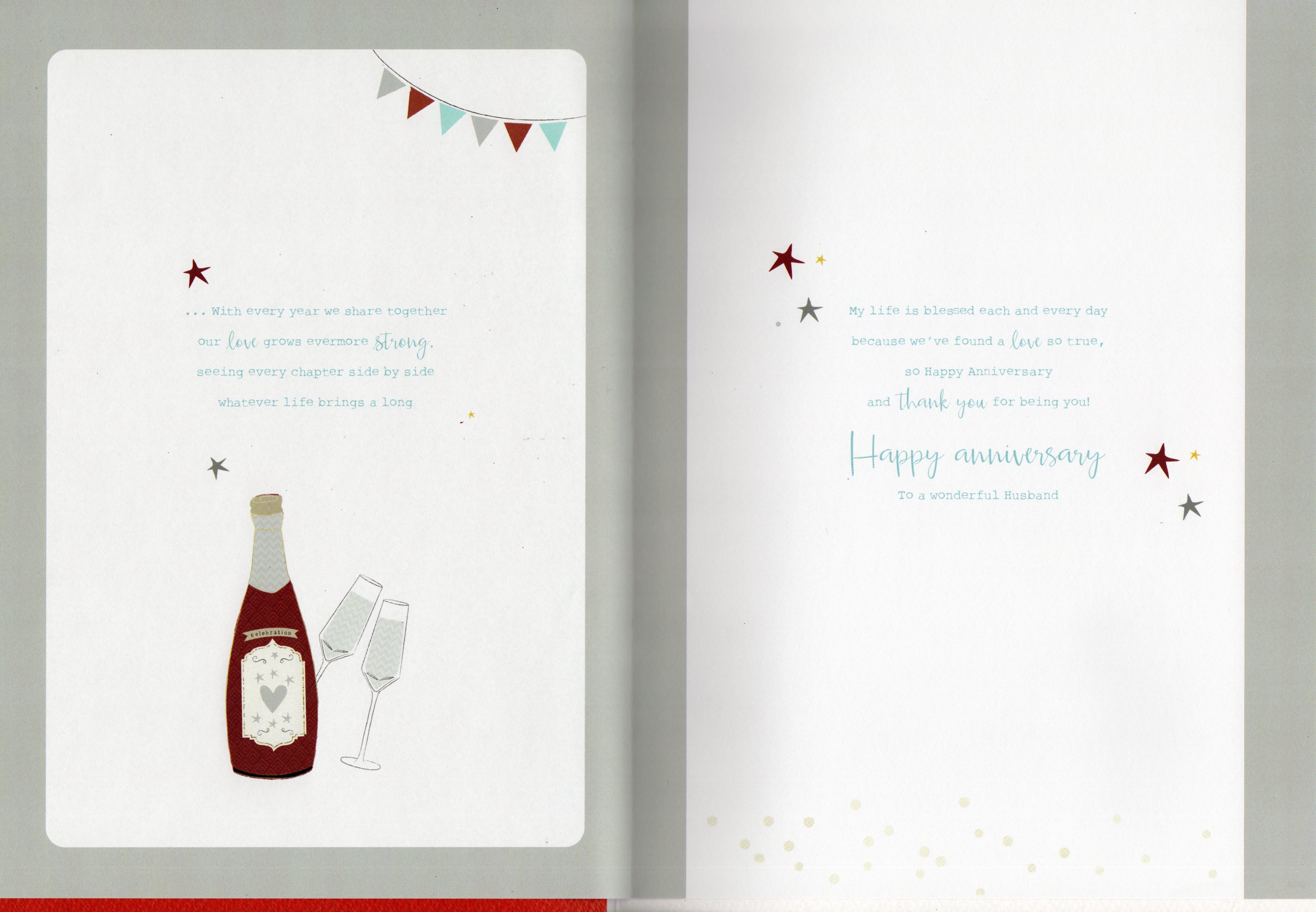 Inside reads: page l This message come to thank you for the love you bring to my life, for i feel so happy every day that I get to say I'm your Wife... page ll ...with every year we share together our love grows evermore strong, seeing every chapter side by side whatever life bring a long page lll My life is blessed each and every day because we've found a love so true, so Happy Anniversary and Thank You for being you! Happy anniversary To a wonderful Husband.