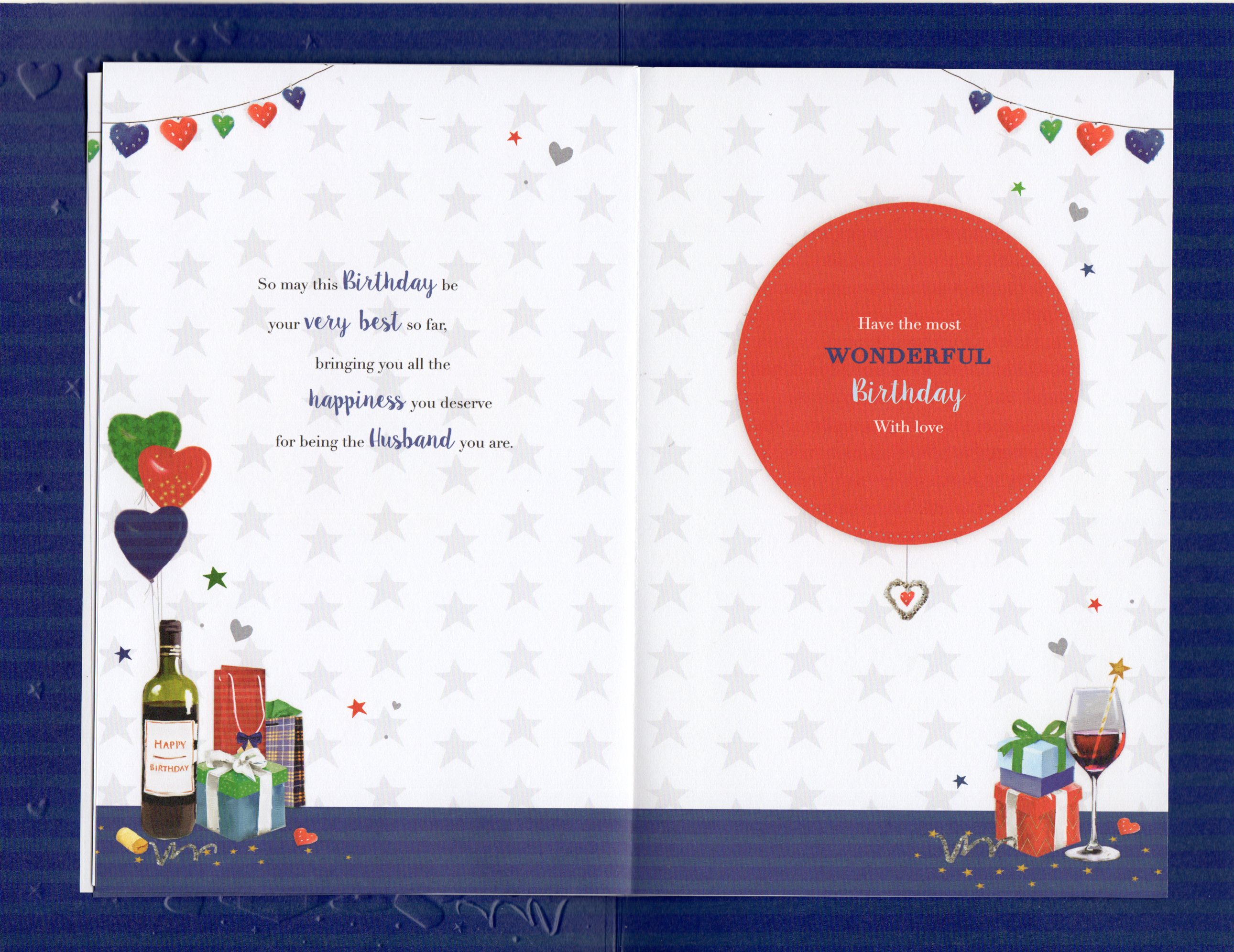Inside reads: page l So sending all my love to you on your very special day... page ll ...To tell you some of the things that I don't always get to say, You're such a fantastic Husband I couldn't ask for more and every year, the love we share, gets even stronger than before. page lll Your caring, kind and thoughtful ways make you more wonderful than you know, you mean more to me than any words could ever show. But I want you to always know on your Birthday and all year through, that the best part of my life is sharing it with you. page IV So may this Birthday be your very best so far, bringing you all the happiness you deserve for being the Husband you are. Have the most wonderful Birthday with love.