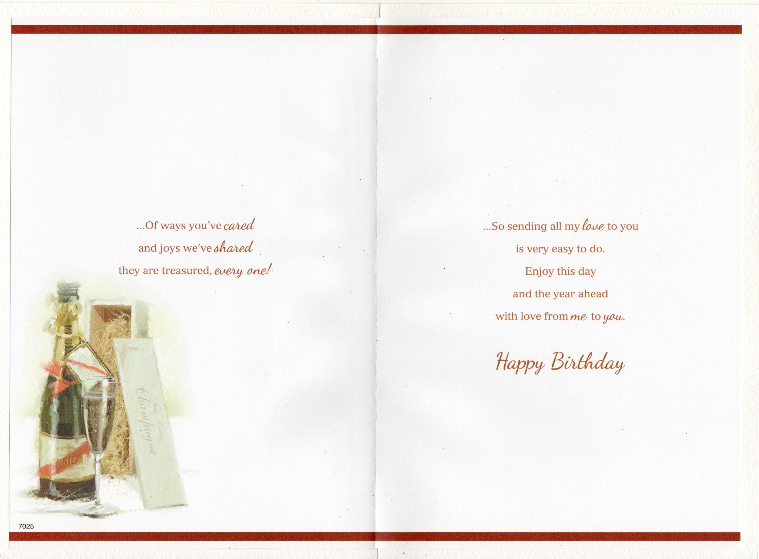 Inside reads: ...Of ways you've cared and joys we've shaved they are treasured, every one! ...So sending all my love to you is very easy to do. enjoy this day and the year ahead with love from me to you. Happy birthday