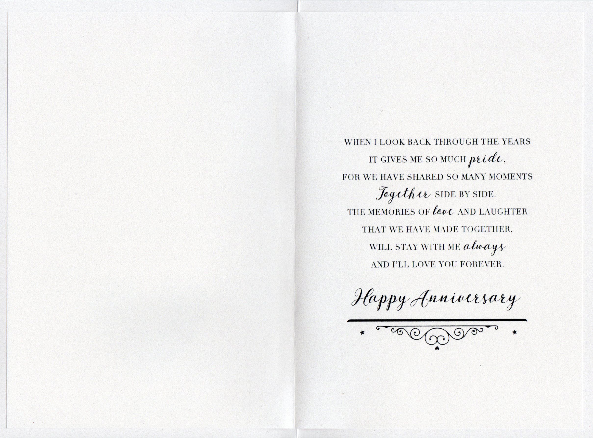 Inside reads: When i look back through the years it gives me so much Pride, for we have shared so many moments Together side by side. The memories of Love and Laughter that we have made together. Will stay with me always and I'll love you forever. Happy Anniversary.