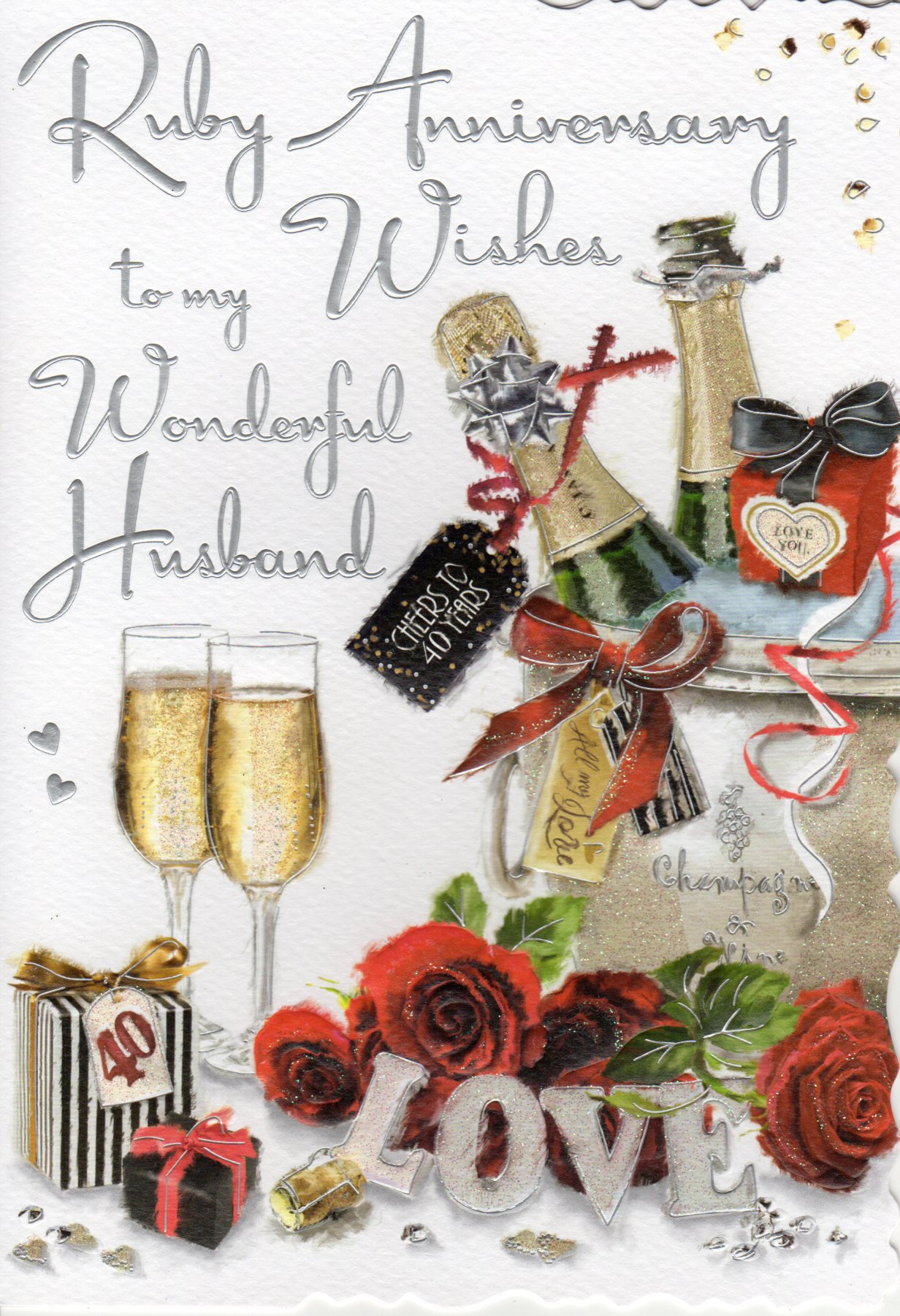 On the front the card reads: Ruby Anniversary Wishes to my Wonderful Husband.. Cheers to 40 Years.. LOVE.