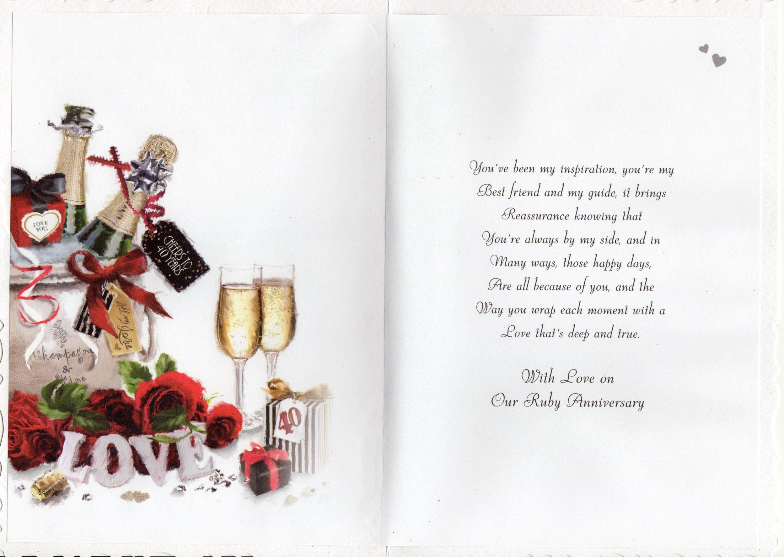 Inside reads: You've been my inspiration, you're my Best friend and my guide, it brings Reassurance knowing that You're always by my side, and in Many ways, those happy days, Are all because of you, and the Way you wrap each moment with a Love that's deep and true. With Love on Our Ruby Anniversary.