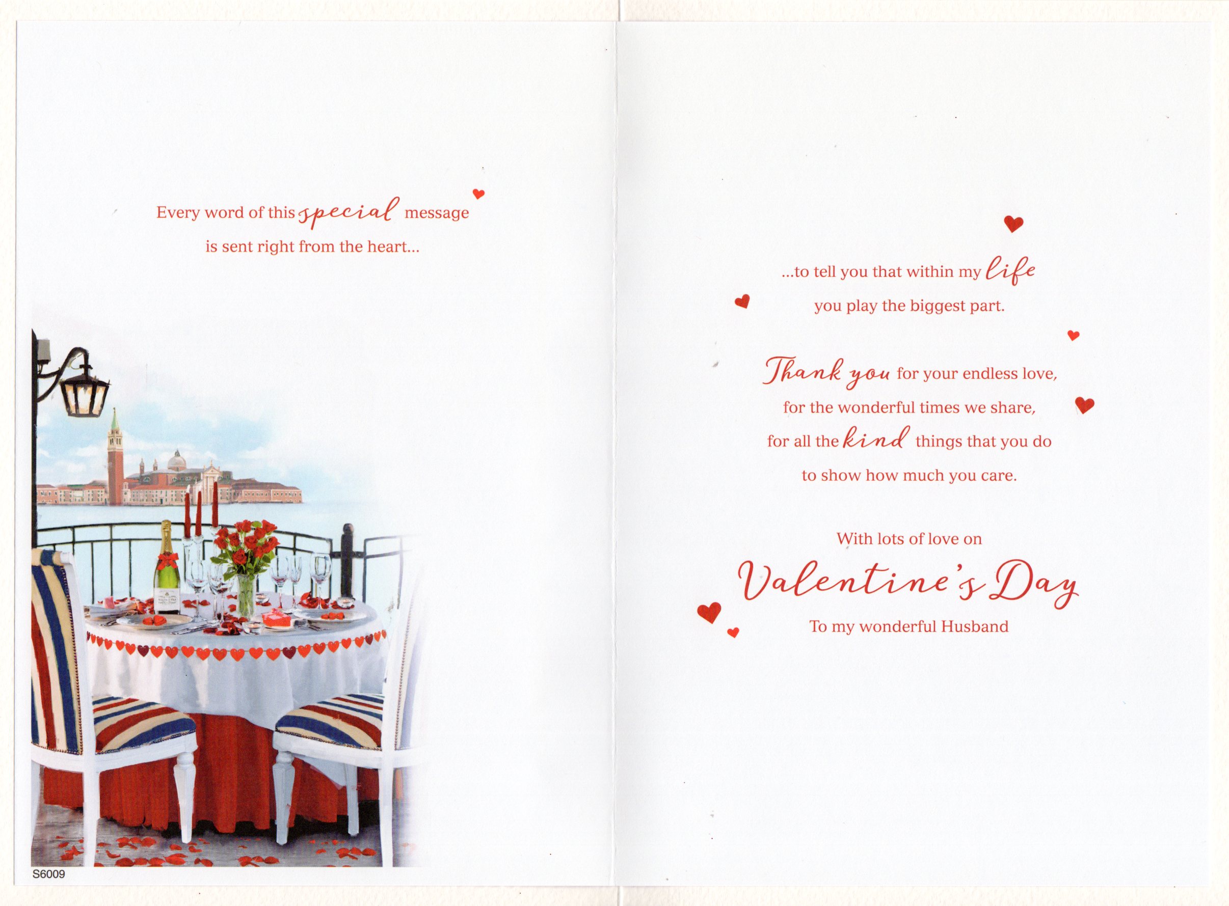 Inside reads: Every word of this special message is sent right from the heart..., ...to tell you that within my life you play the biggest part. Thank you for your endless love, for the wonderful time we share, for all the kind things that you do to show how much you care. with lots of love on Valentine's Day To my wonderful Husband