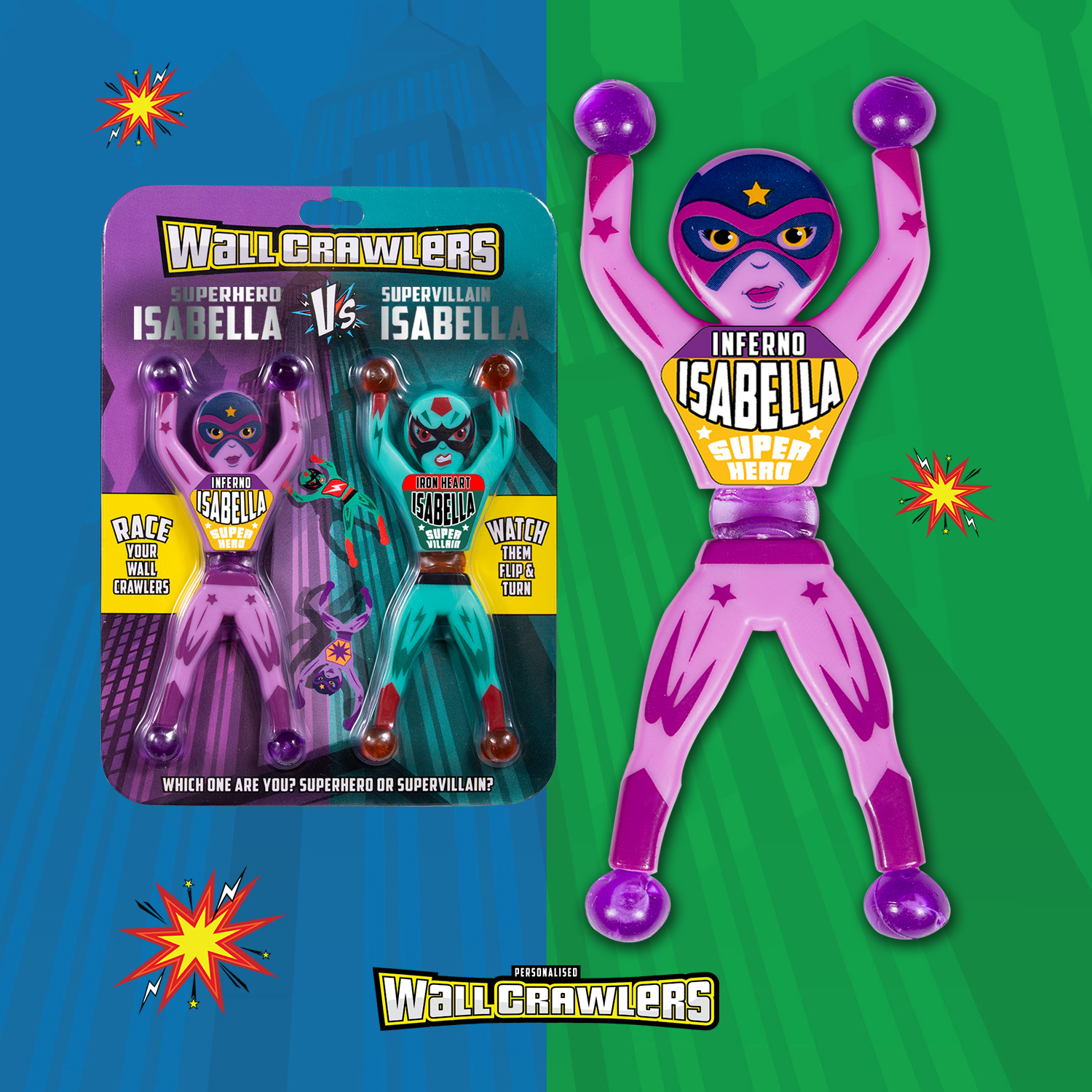 Throw your superhero and supervillain Wall Crawlers at a smooth vertical surface- try a wall, window or even bathroom tiles and see a super race in action!