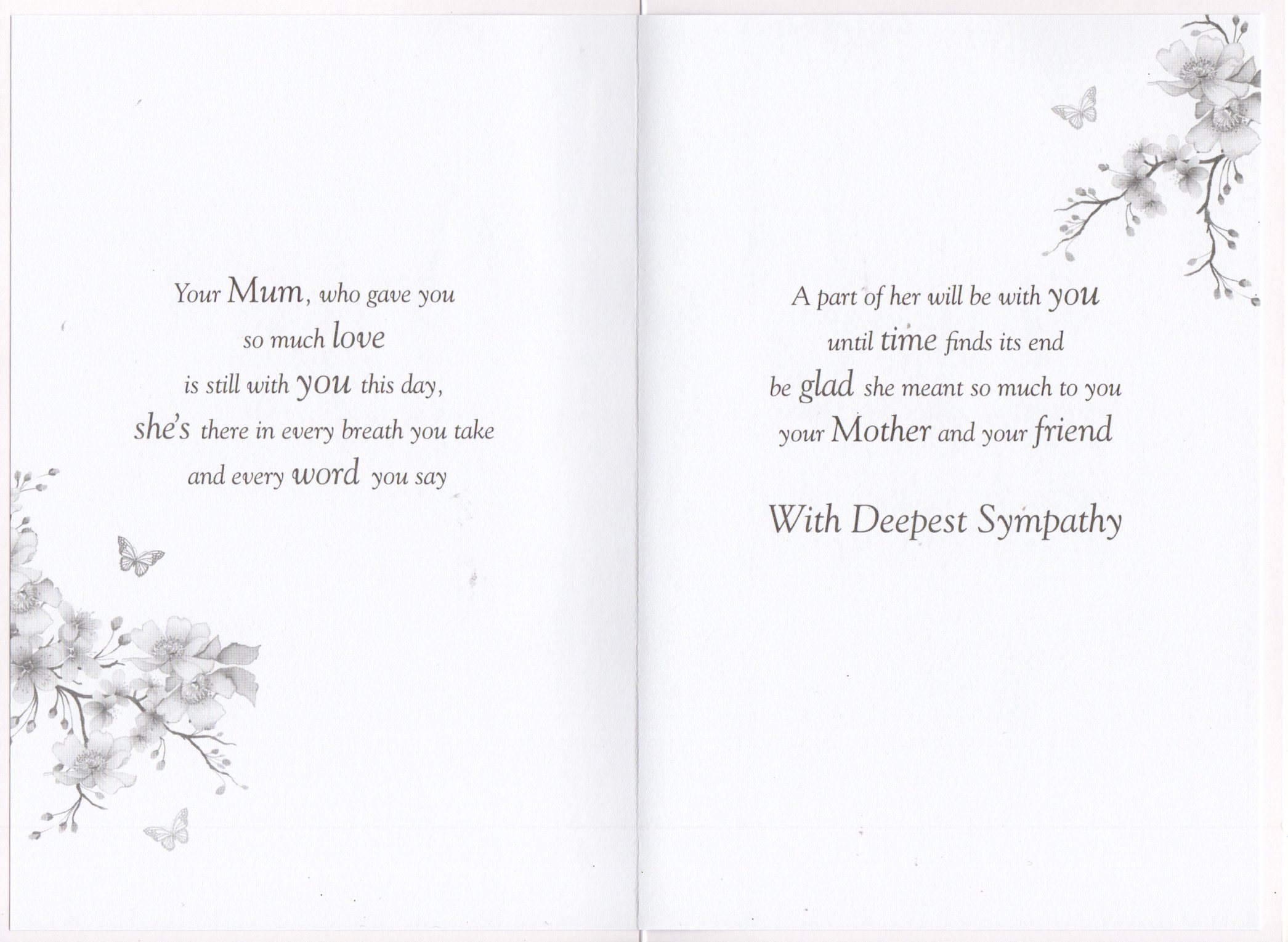 Inside reads: Your Mum, who gave you so much Love is still with you this day, she's there in every breath you take and every word you say, A part of her will be with you until time finds its end be glad she meant so much to you your Mother and your friend With Deepest Sympathy