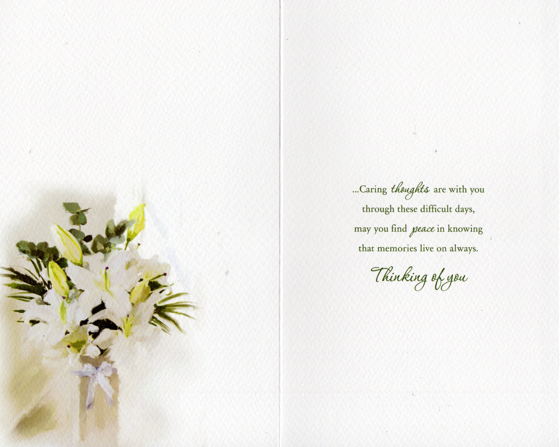 Inside reads: ...Caring thoughts are with you through these difficult days, may you find peace in knowing that memories live on always. Thinking of you