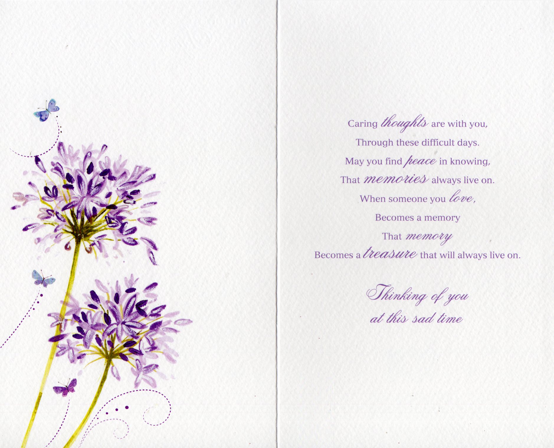 Inside reads: Caring thoughts are with you, Through these difficult days. May you find peace in knowing, That memories always live on. When someone you love, Become a memory That memory Becomes a treasure that will always live on. Thinking Of You at this sad time