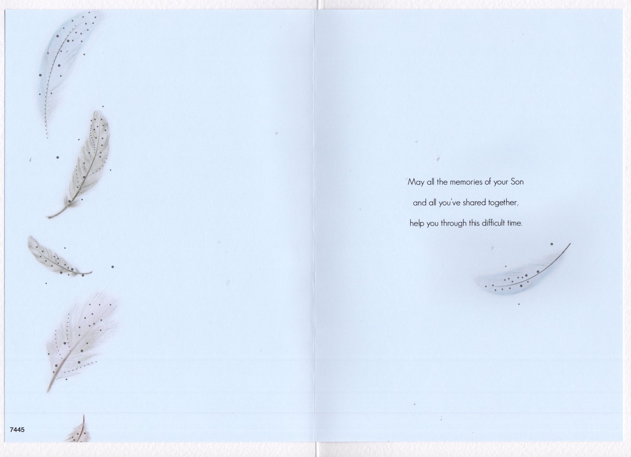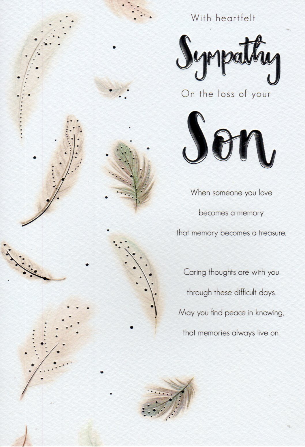 On the front the card reads: with heartfelt Sympathy On the loss of your Son when someone you love becomes a memory that memory becomes a treasure. Caring thoughts are with you through these difficult days. May you find peace in knowing, that memories always live on.