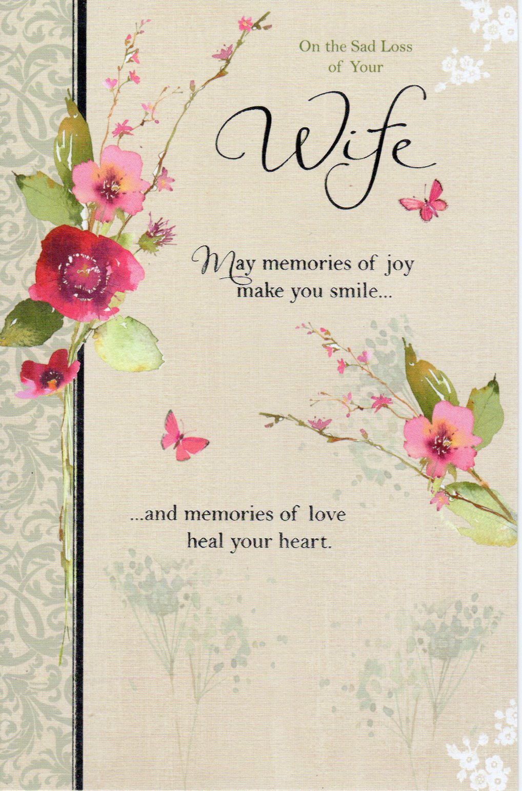 On the front the card reads: On the Sad Loss Of your Wife may memories of joy make you smile..., ...and memories of love heal your heart.