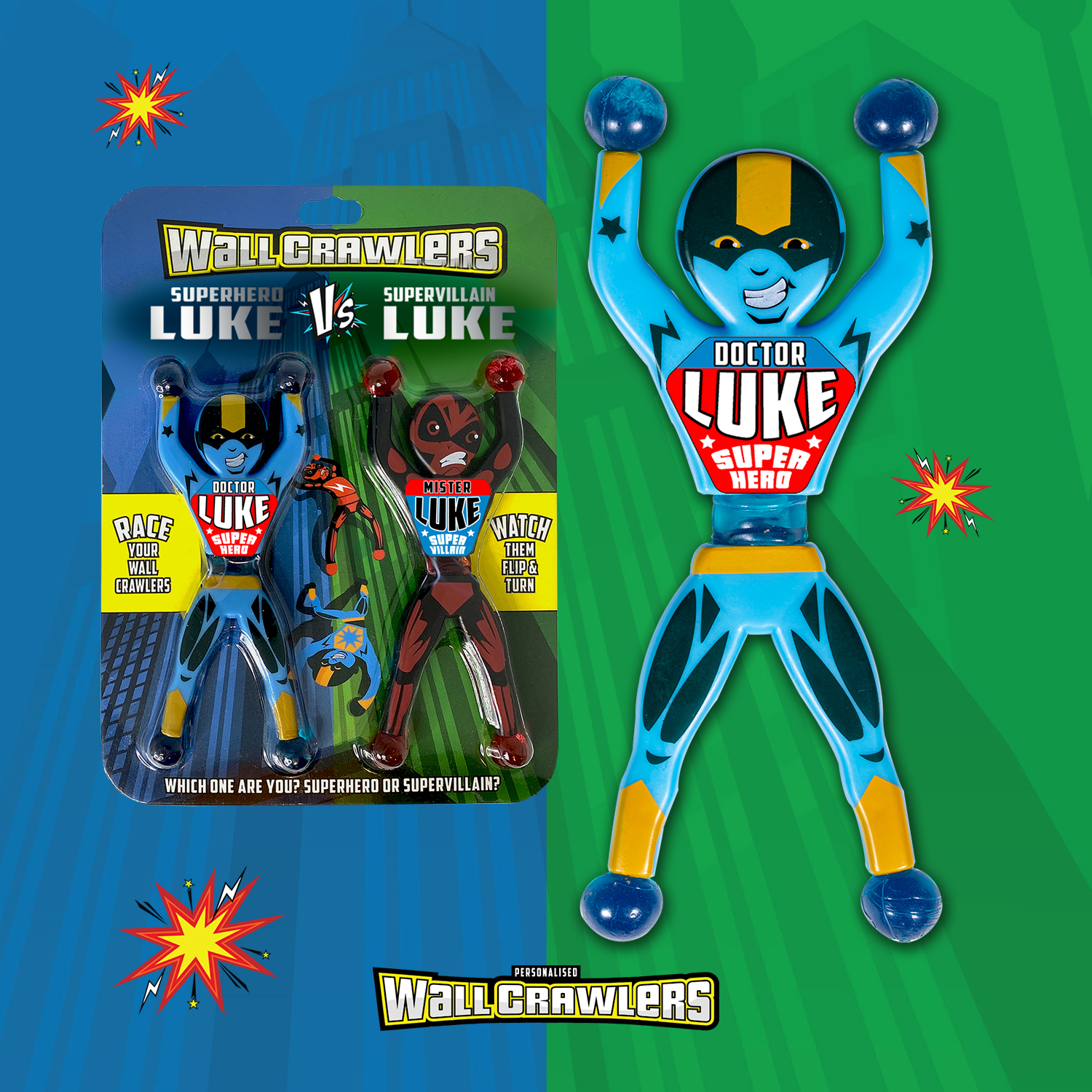 Throw your superhero and supervillain Wall Crawlers at a smooth vertical surface- try a wall, window or even bathroom tiles and see a super race in action!