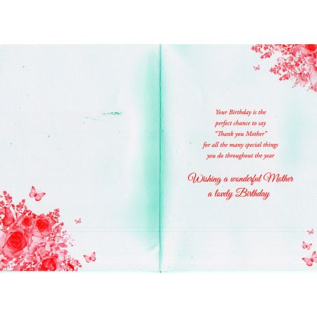 Inside reads: Your Birthday is the perfect chance to say ''Thank you Mother'' for all the many special things you do throughout the year Wishing a wonderful Mother a lovely Birthday