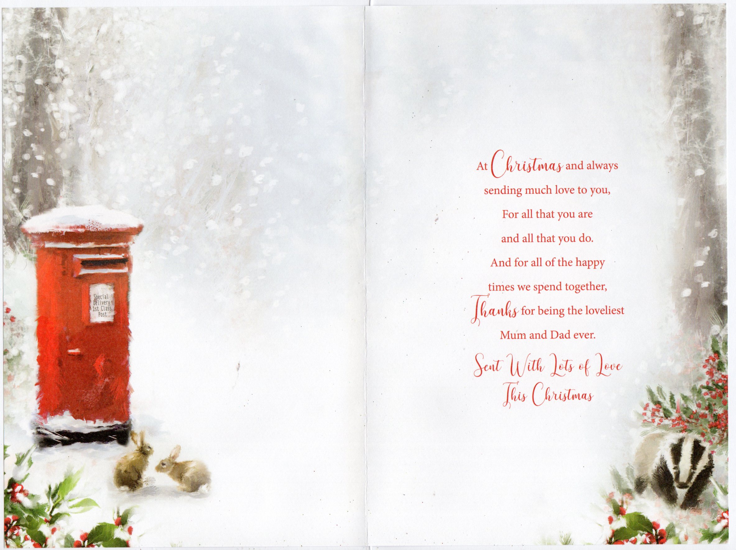 Inside reads: At Christmas and always sending much love to you, For all that you are and all that you do. And for all of the happy times we spend together, Thanks for being the loveliest Mum and Dad ever. Sent With Lots Of Love This Christmas
