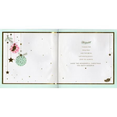 Inside reads: ...Thanks For being there and for being such amazing parents Love You Always! Have The Wonderful Christmas You Both Deserve