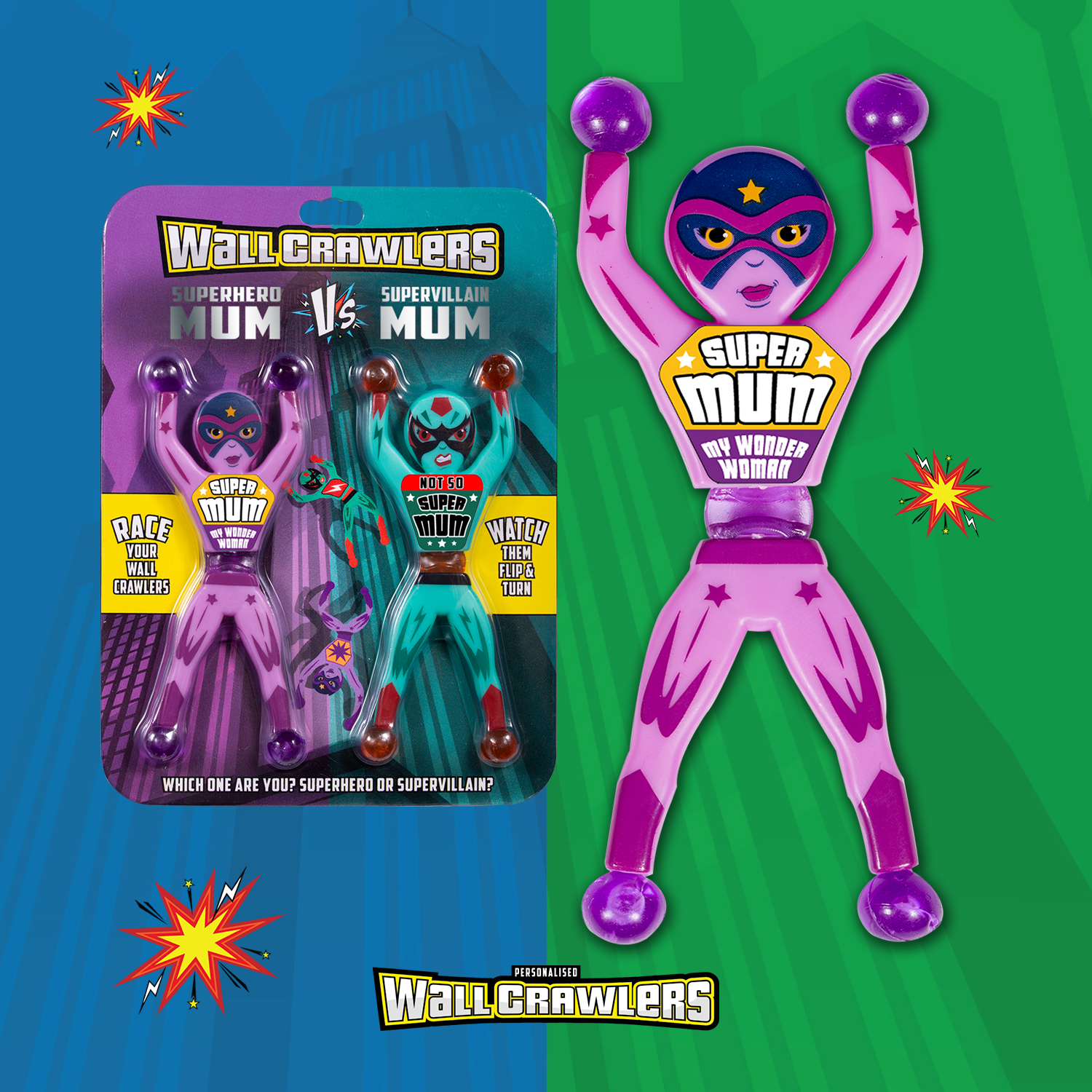 Throw your superhero and supervillain Wall Crawlers at a smooth vertical surface- try a wall, window or even bathroom tiles and see a super race in action!