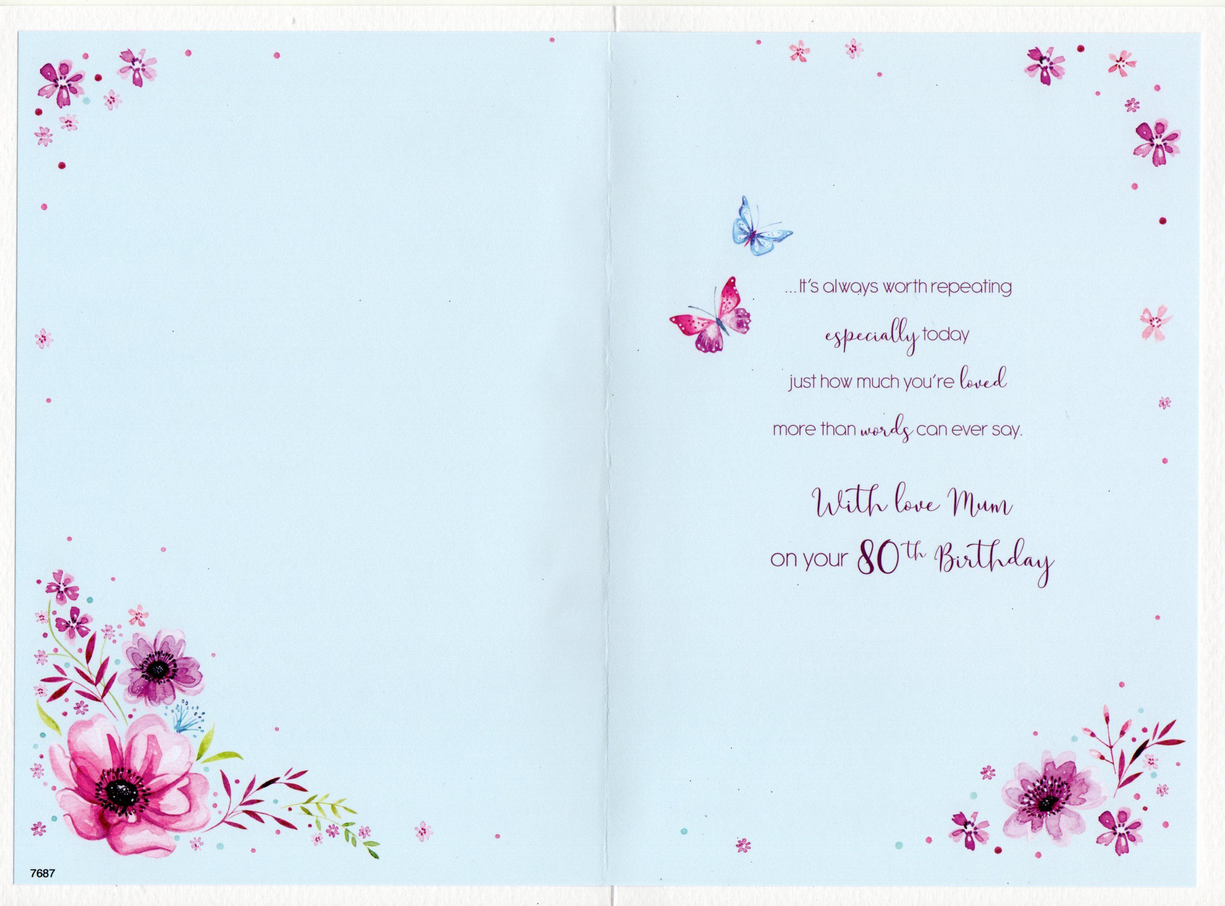 On the front the card reads: For a wonderful Mum on your 80th Birthday here's to the greatest Mum by far, i hope you'll always understand how wonderful you are...
