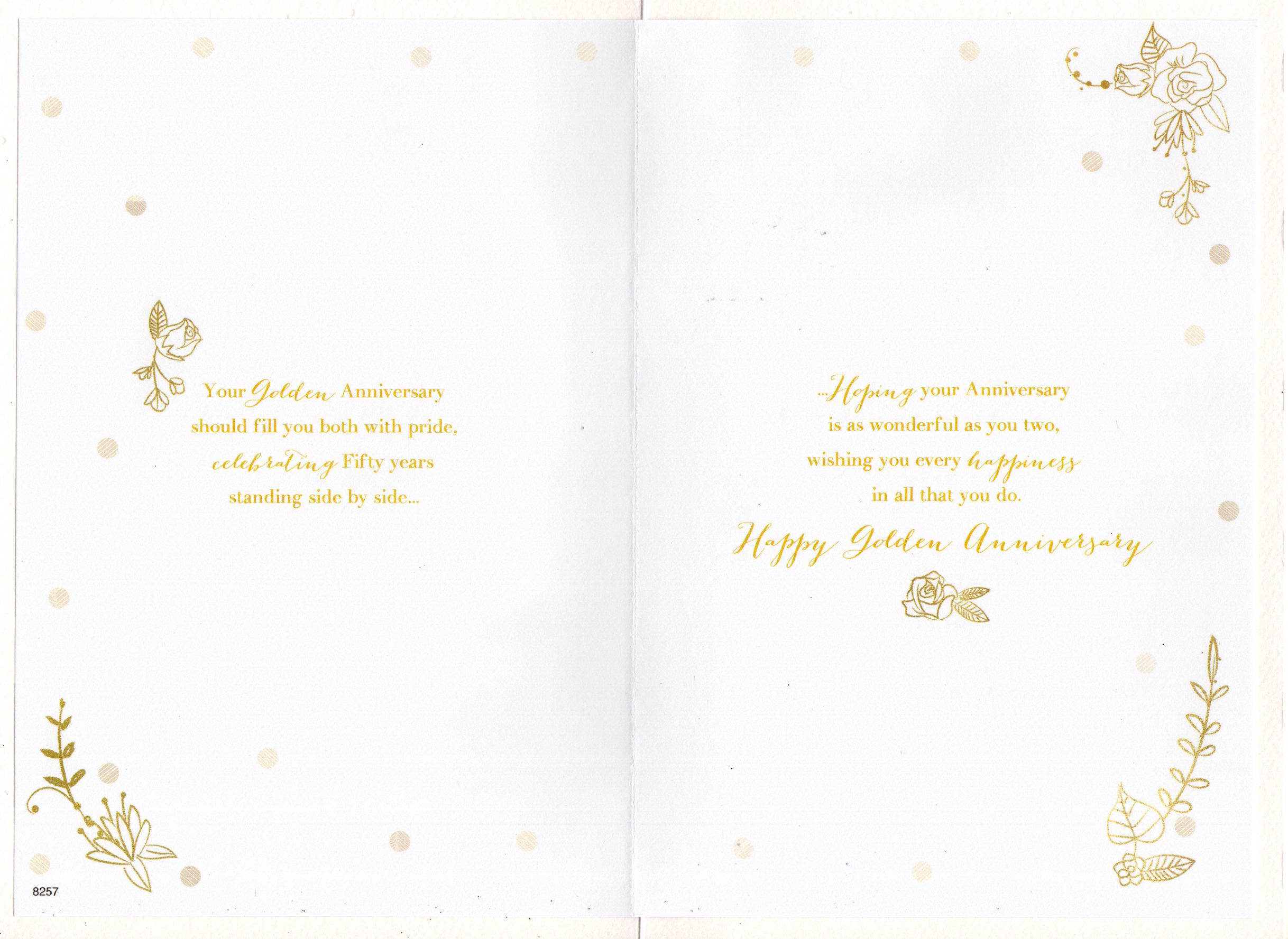 Inside reads: Your Golden Anniversary should fill you both with pried, celebrating Fifty Years standing side by side..., ...Hoping your Anniversary is as wonderful as you two, wishing you every happiness in all that you do. Happy Golden Anniversary.