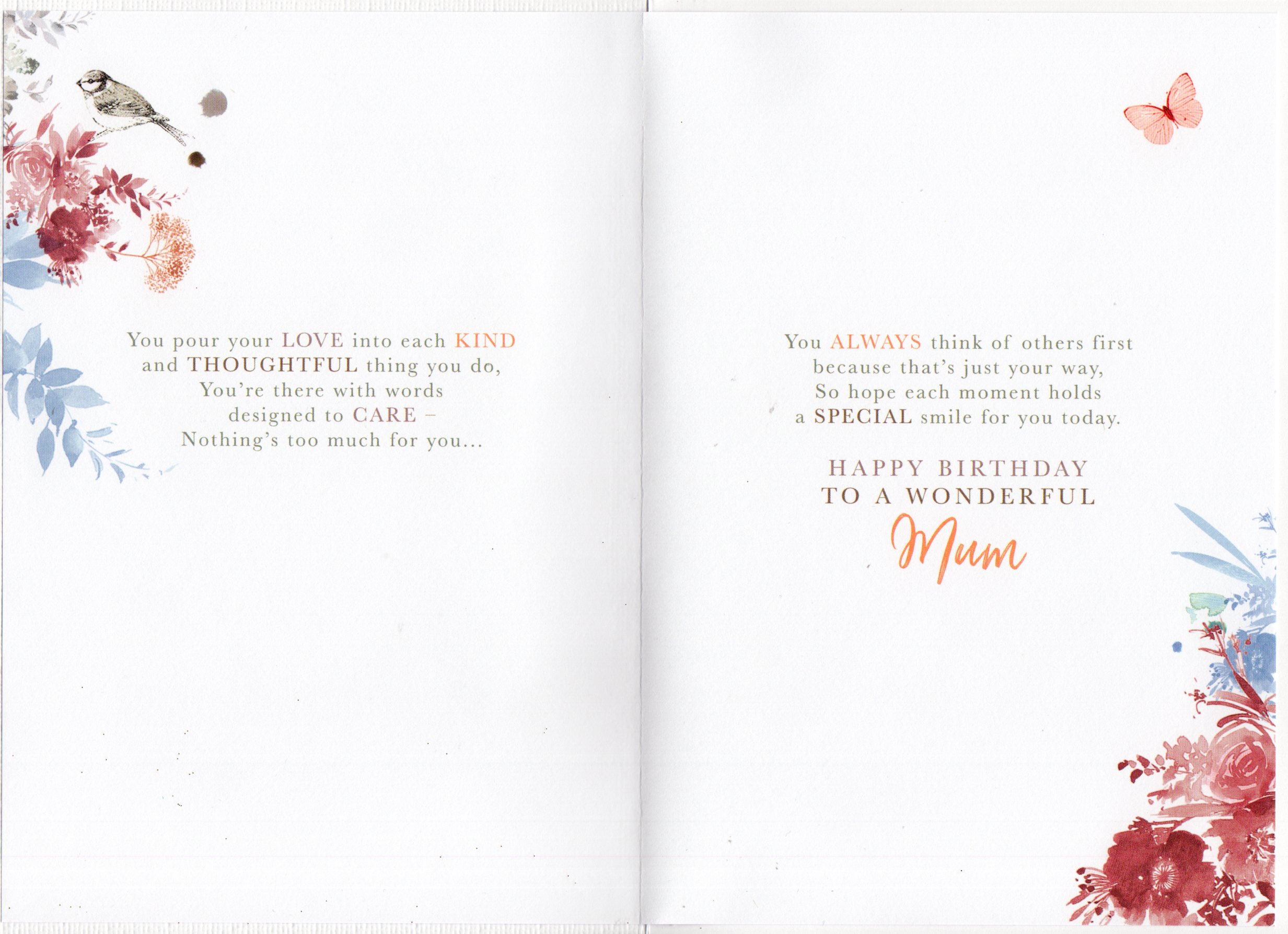 Inside reads: You pour your Love into each Kind and Thoughtful thing you do, You're there with words designed to Care - Nothing too much for you..., You Always think of others first because that's just your way, So hope each moment holds a Special smile for you today. Happy Birthday To A Wonderful Mum