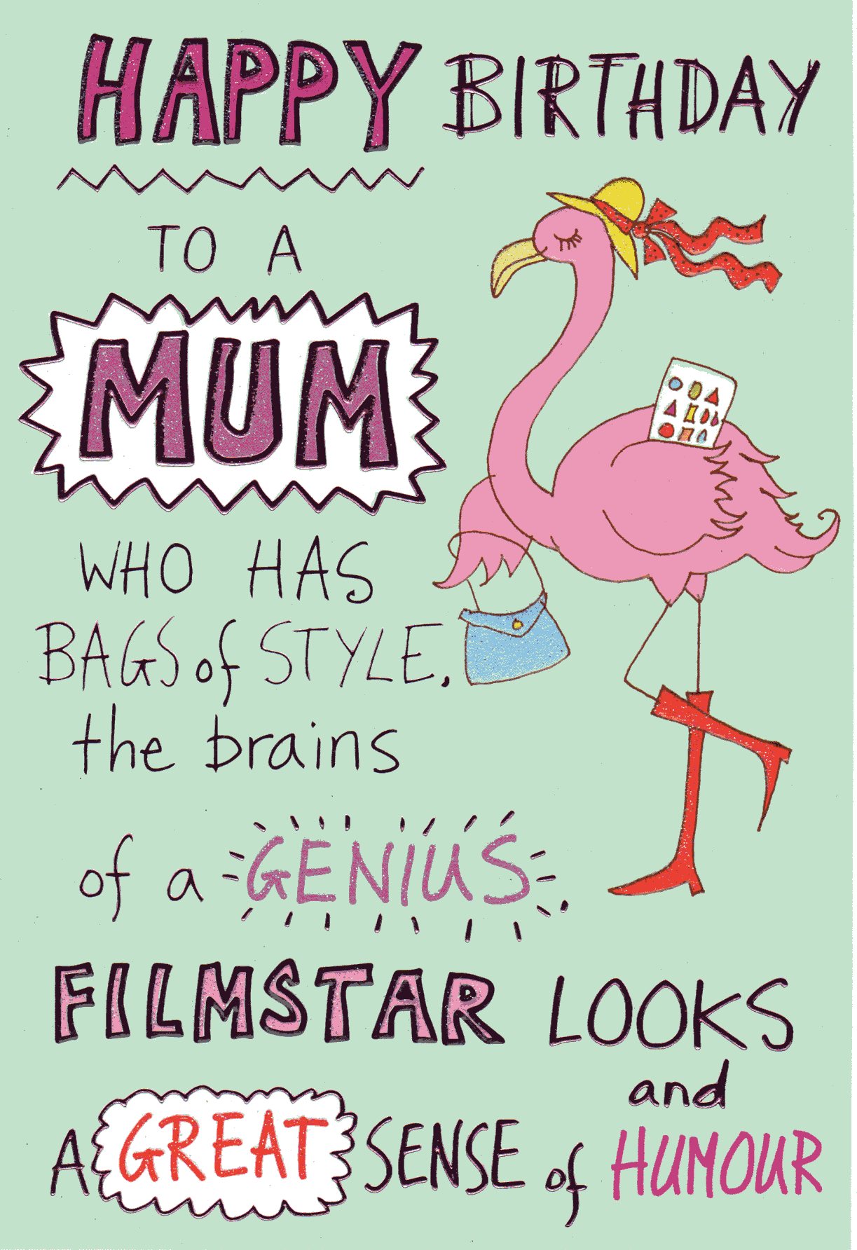 On the front the card reads: Happy Birthday to a Mum who has Bags of style, the brains of a Genius Filmstar Looks and A great sense of Humour.