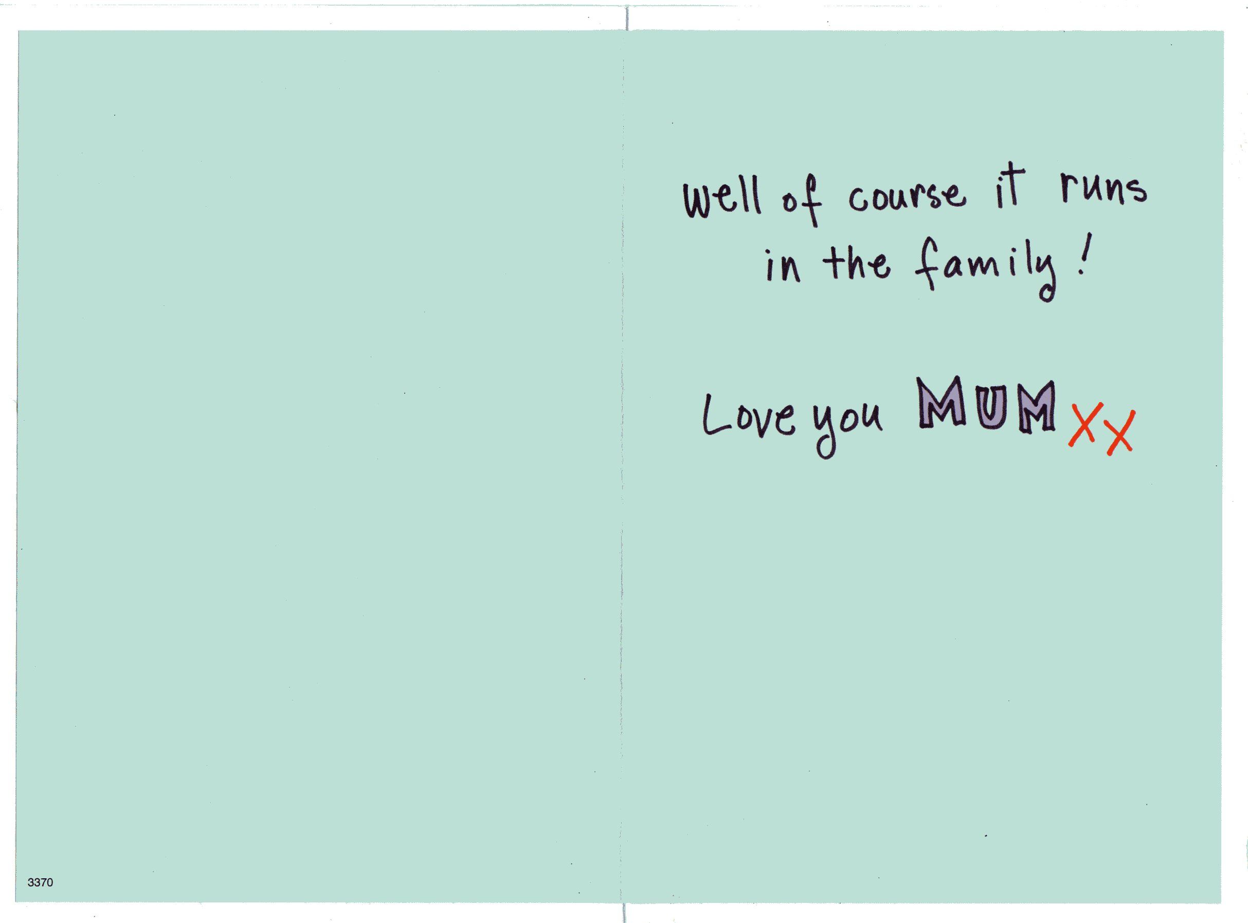 Inside reads: Well of course it runs in the family! Love you Mum xx