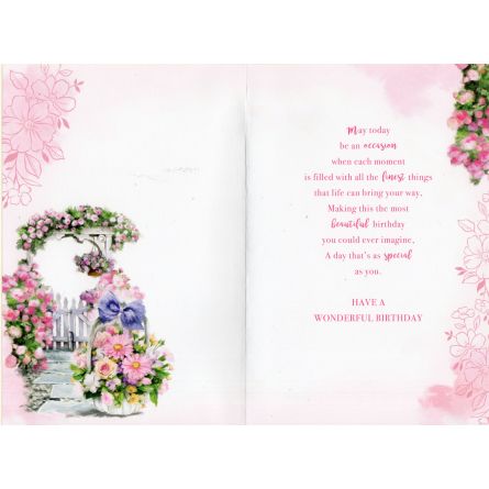 Inside reads: May today be an occasion when each moment is filled with all the finest things that life can bring your way, Making this the most beautiful birthday you could ever imagine, A day that's as special as you. Have A Wonderful Birthday