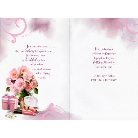 Inside reads: Just a message to say - May your birthday be happy for you! You've always been so thoughtful and kind and you show how much you care in all the things you do. Today is about you, so here's wishing every happy thing for your birthday followed by a wonderful year. With Love For A Fabulous Birthday