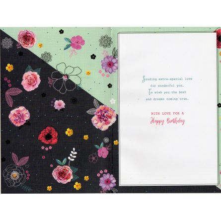 Inside reads: Sending extra-special love for wonderful you, To wish you the best and dreams coming true. With Love For A Happy Birthday