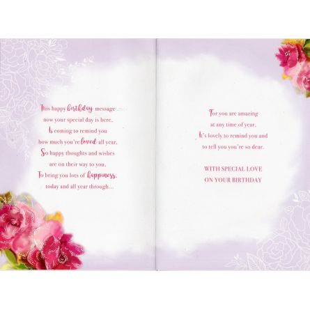 Inside reads: This happy birthday message now your special day is here, Is coming to remind you how much you're loved all year, So happy thoughts and wishes are on their way to you, To bring you lots of happiness, today and all year through..., For you are amazing at any time of year, It's lovely to remind you and to tell you you're so dear. With Special Love On Your Birthday