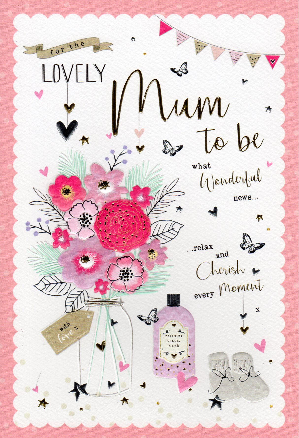 On the front the card reads: For The Lovely Mum to be what wonderful news..., ...relax and Cherish every moment.