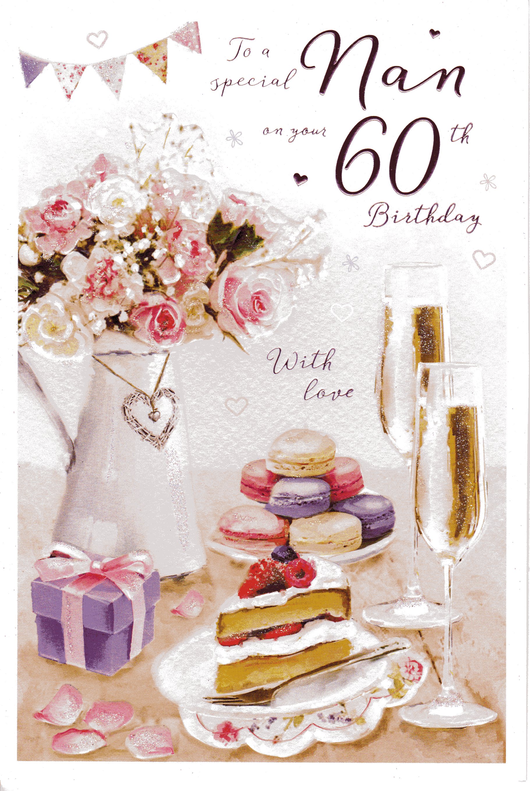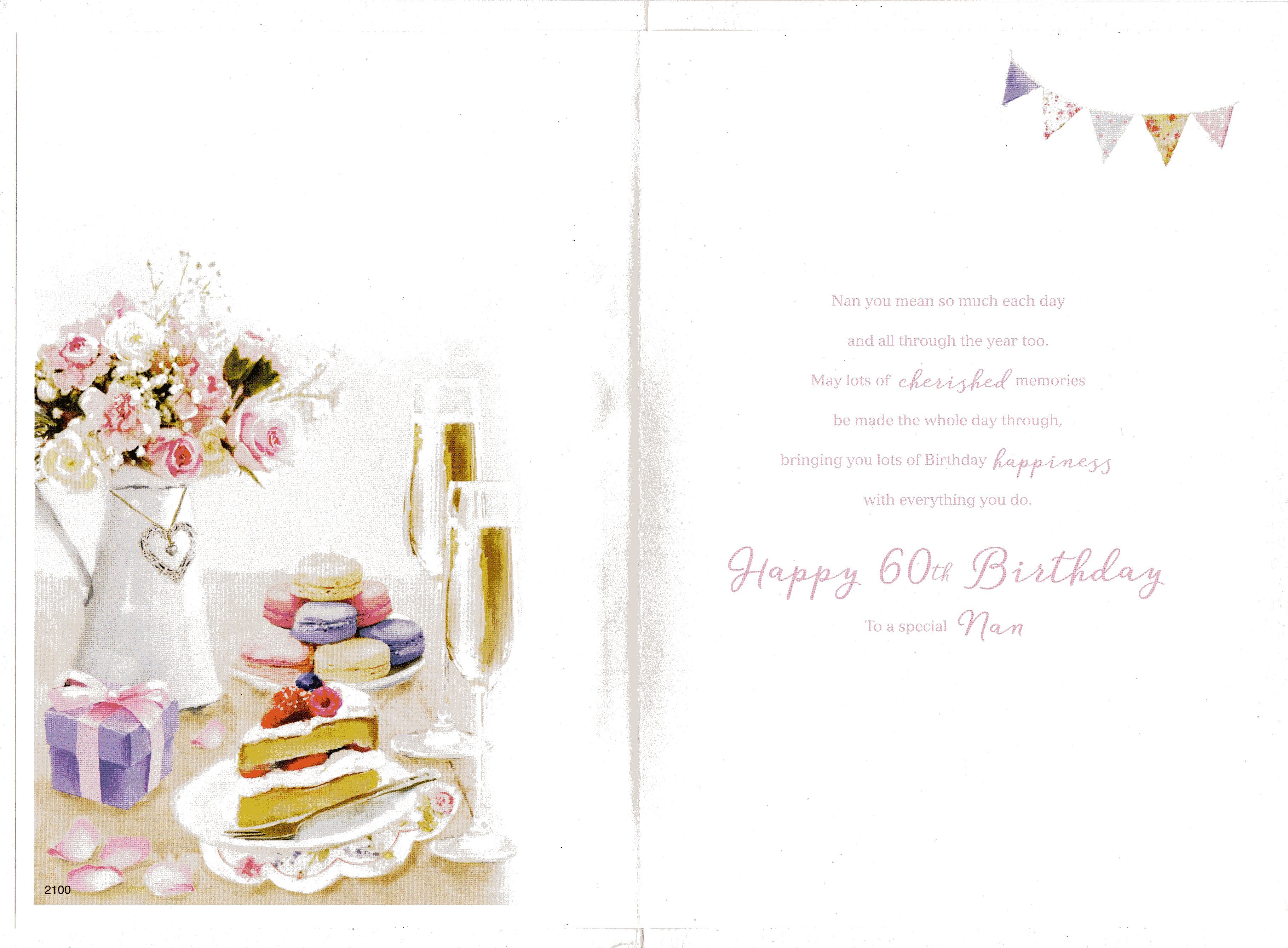 Inside reads: Nan you means so much each day and all through the year too. May lots of cherished memories be made the whole day through, bringing you lots of Birthday happiness with everything you do. Happy 60th Birthday To a special Nan