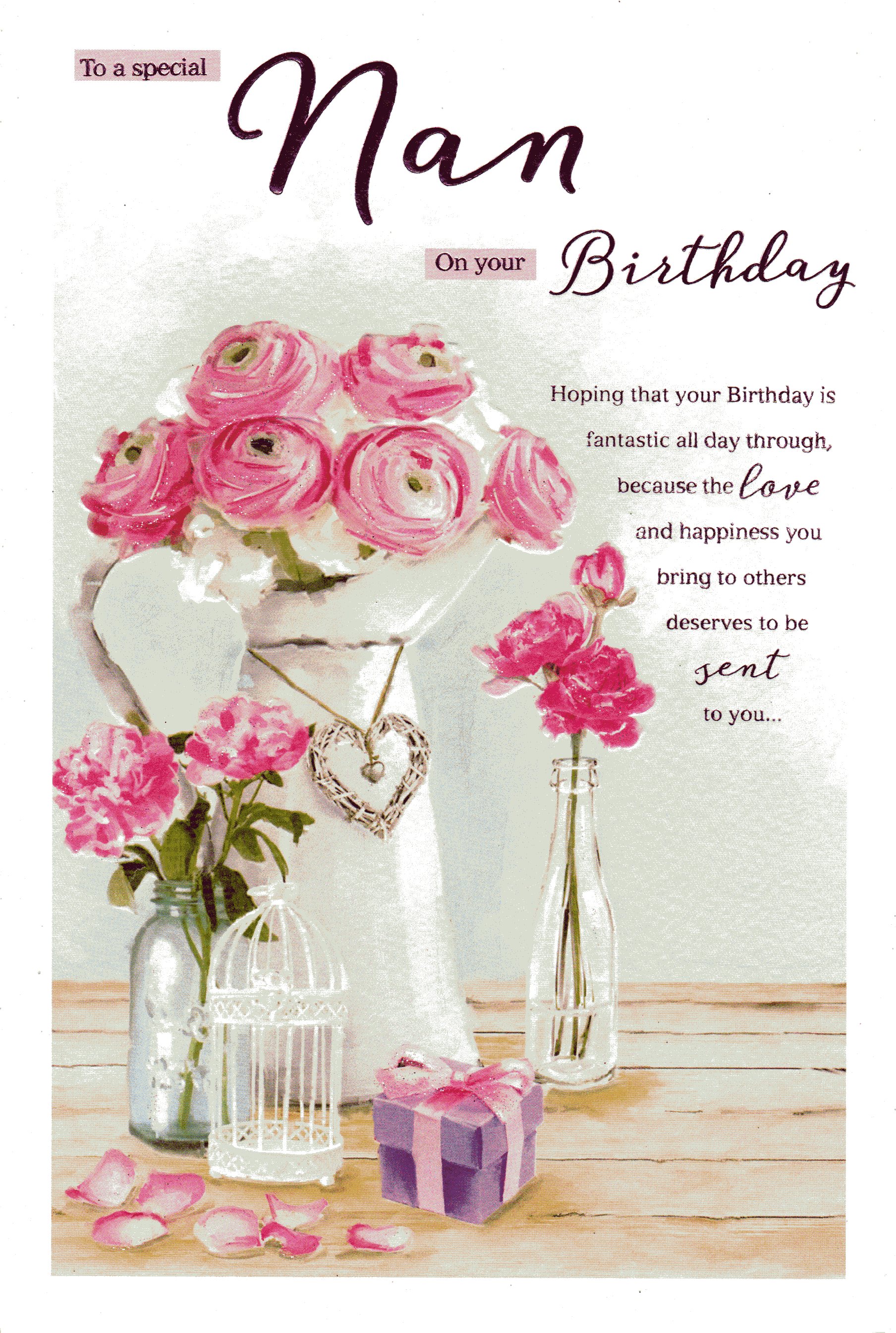 On the front the card reads: To a special Nan on your Birthday Hoping that your Birthday is fantastic all day through, because the love and happiness you bring to others deserves to be sent you...