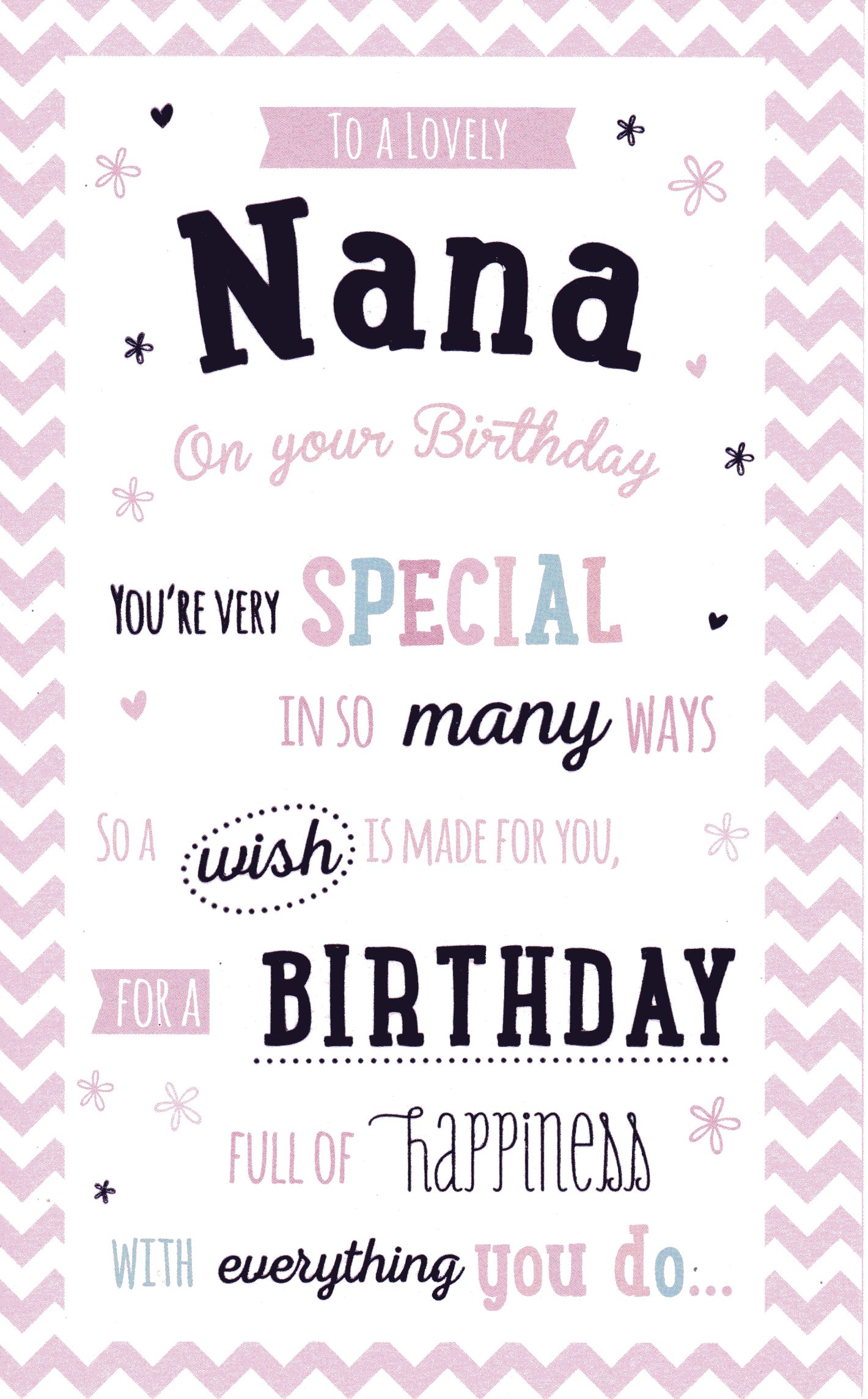 On the front the card reads: To a lovely Nana on your Birthday you're very special in so many ways wish is made for you, for a Birthday full of happiness with everything you do...