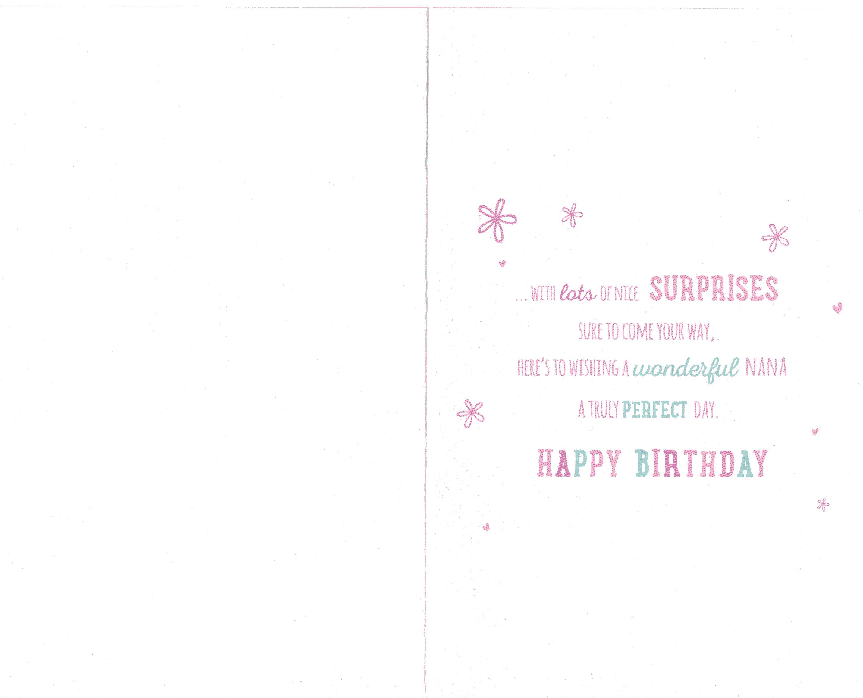 Inside reads: ...With lots of nice Surprises sure to come your way, Here's to wishing a wonderful Nana a truly perfect Day. Happy Birthday