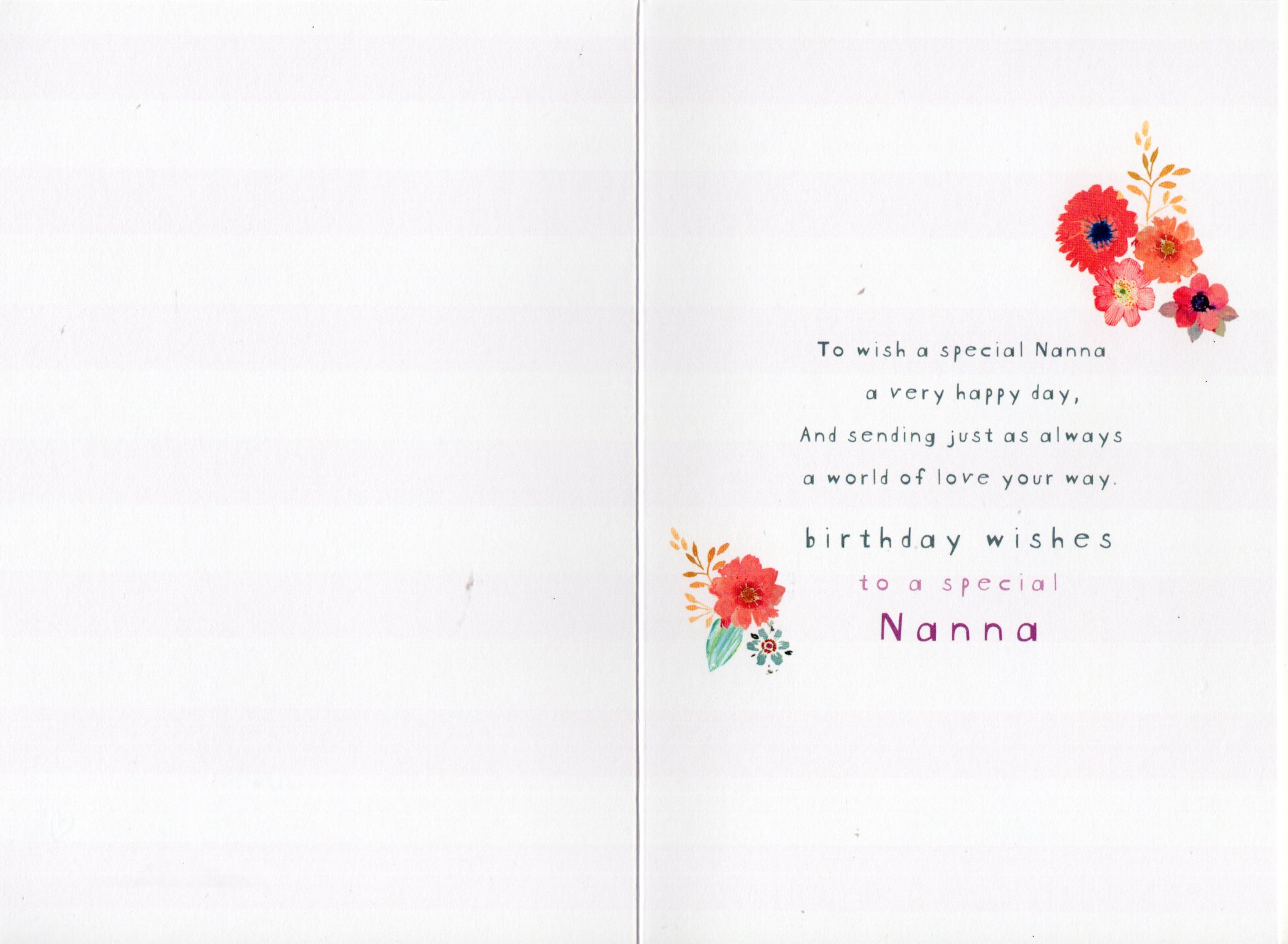 Inside reads: To wish a special Nanna a very happy day, And sending just as always a world of love your way. birthday wishes to a special Nanna