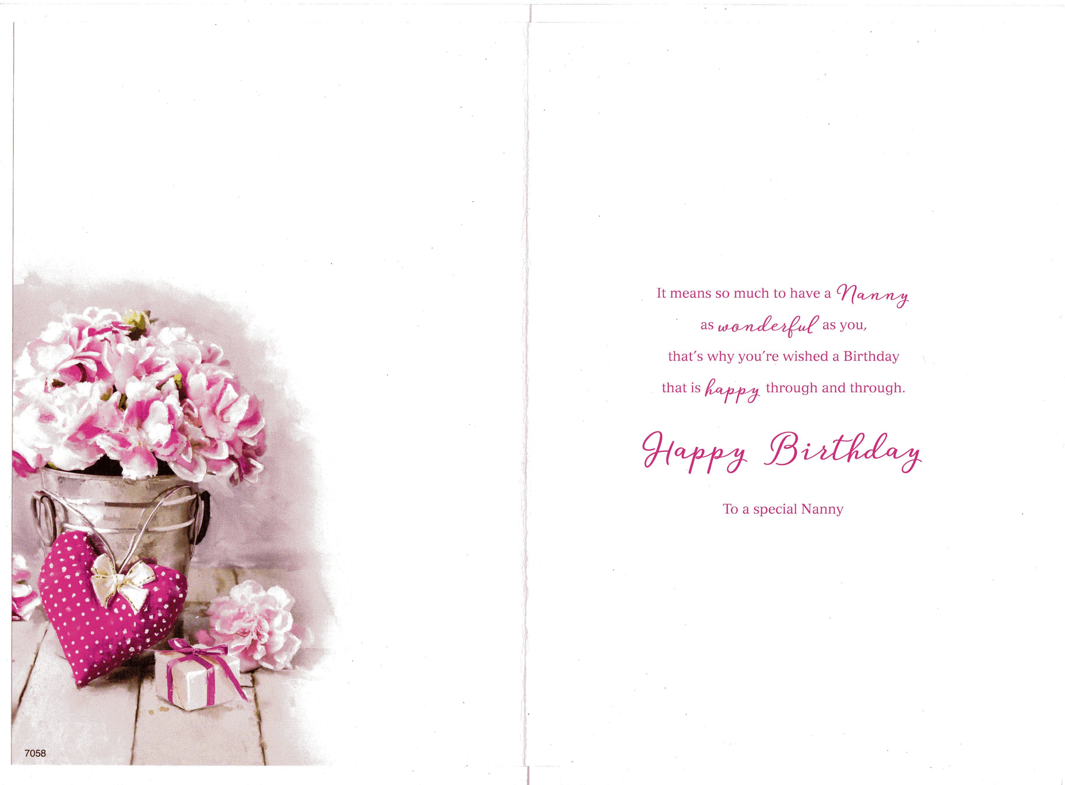 Inside reads: It means so much to have a Nanny as wonderful as you, that's why you're wished a Birthday that is happy through and through. Happy Birthday To a special Nanny