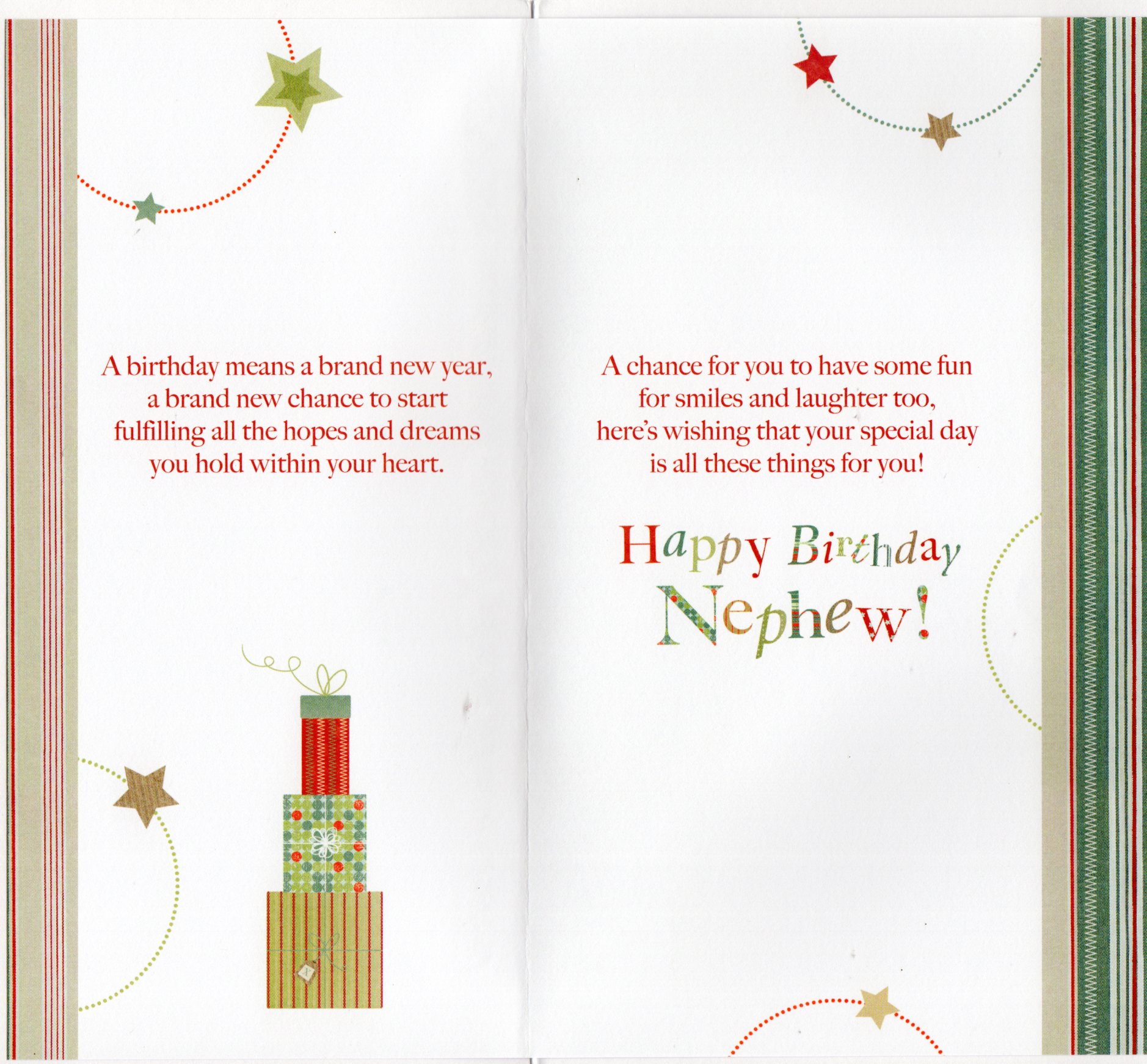 Inside reads: A birthday means a brand new year, a brand new chance to start fulfilling all the hopes and dreams you hold within your heart. A chance for you to have some fun for smiles and laughter too, here's wishing that your special day is all these thing for you! Happy Birthday Nephew!