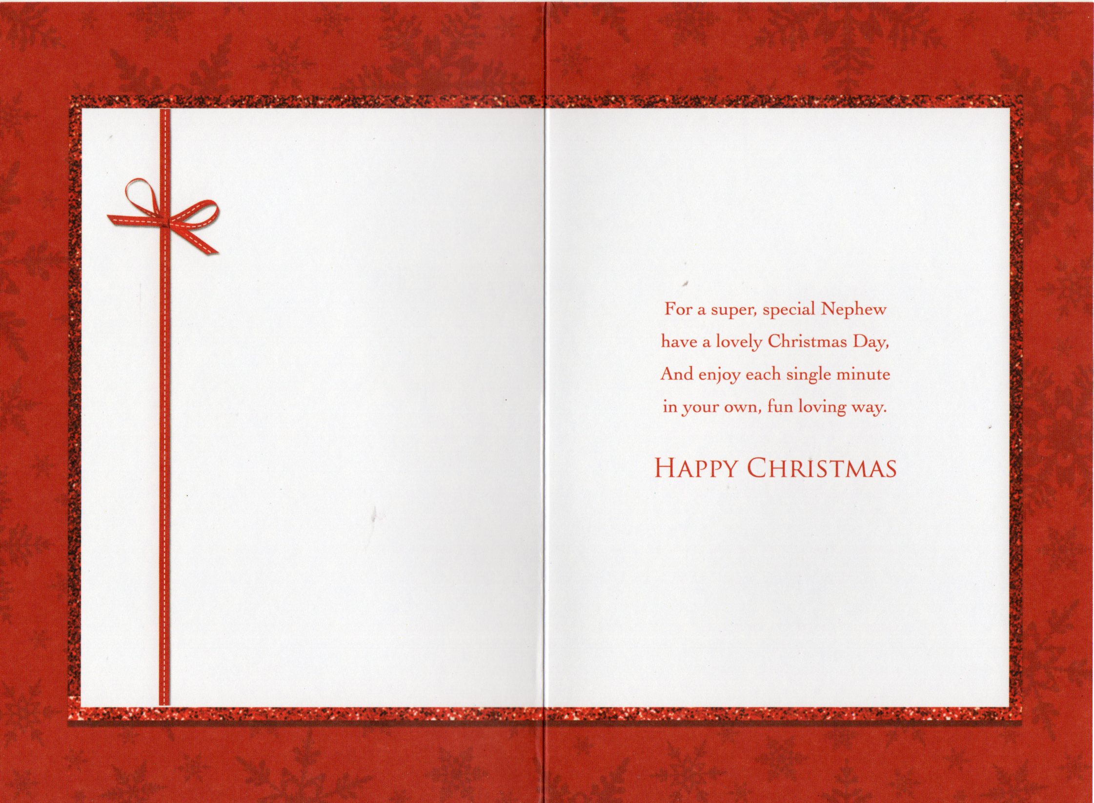 Inside reads: For a super, special Nephew have a lovely Christmas Day, And enjoy each single minute in your own, fun loving way. Happy Christmas