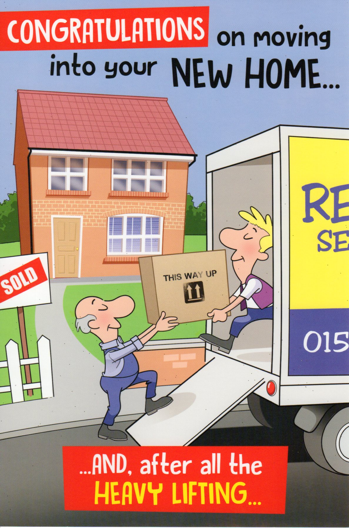 On the front the card reads: Congratulations on moving into your New Home..., ...And, after all the Heavy Lifting...