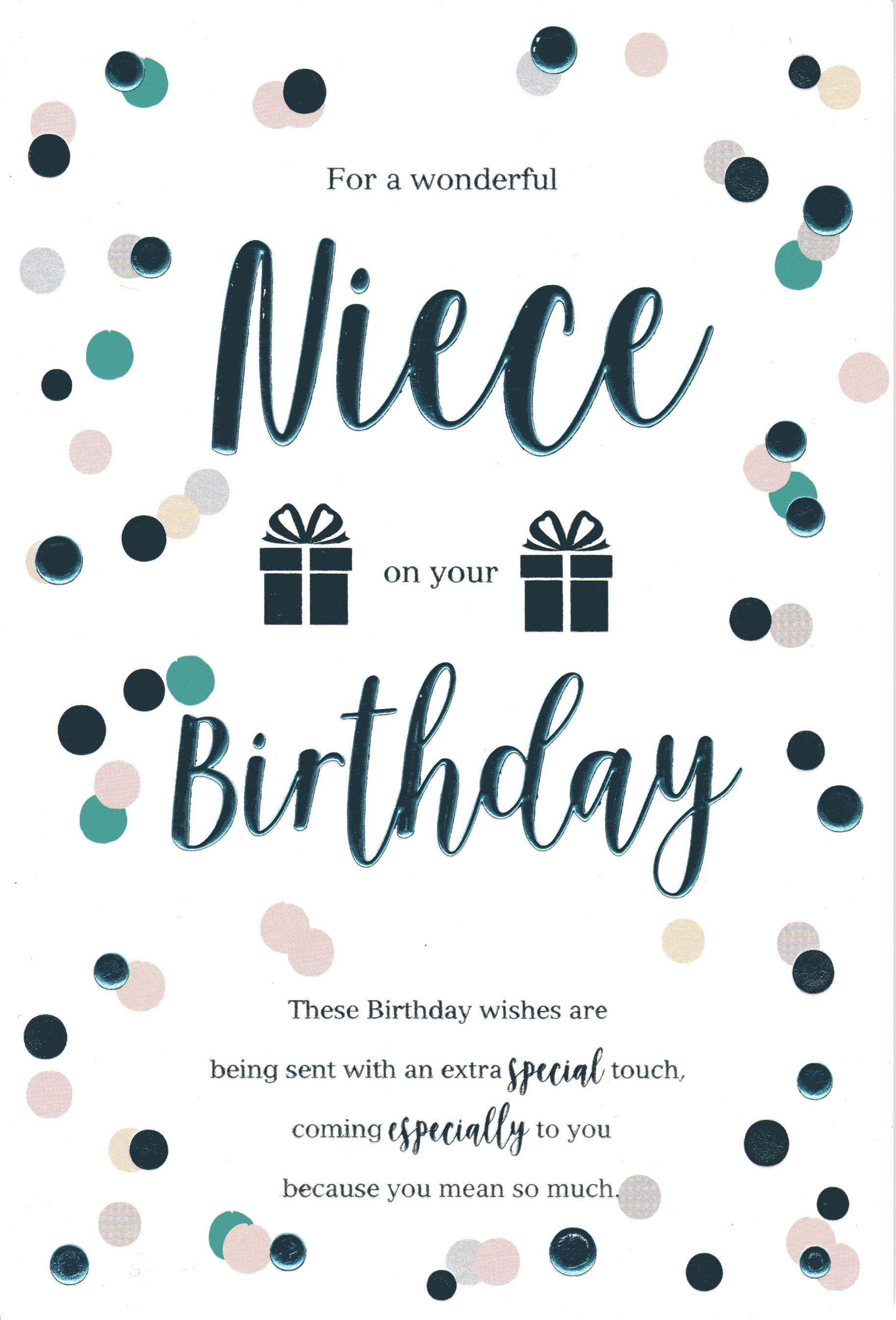 On the front the card reads: To a Wonderful Niece on your Birthday These Birthday wishes are being sent with an extra special touch, coming especially to you because you mean so much.