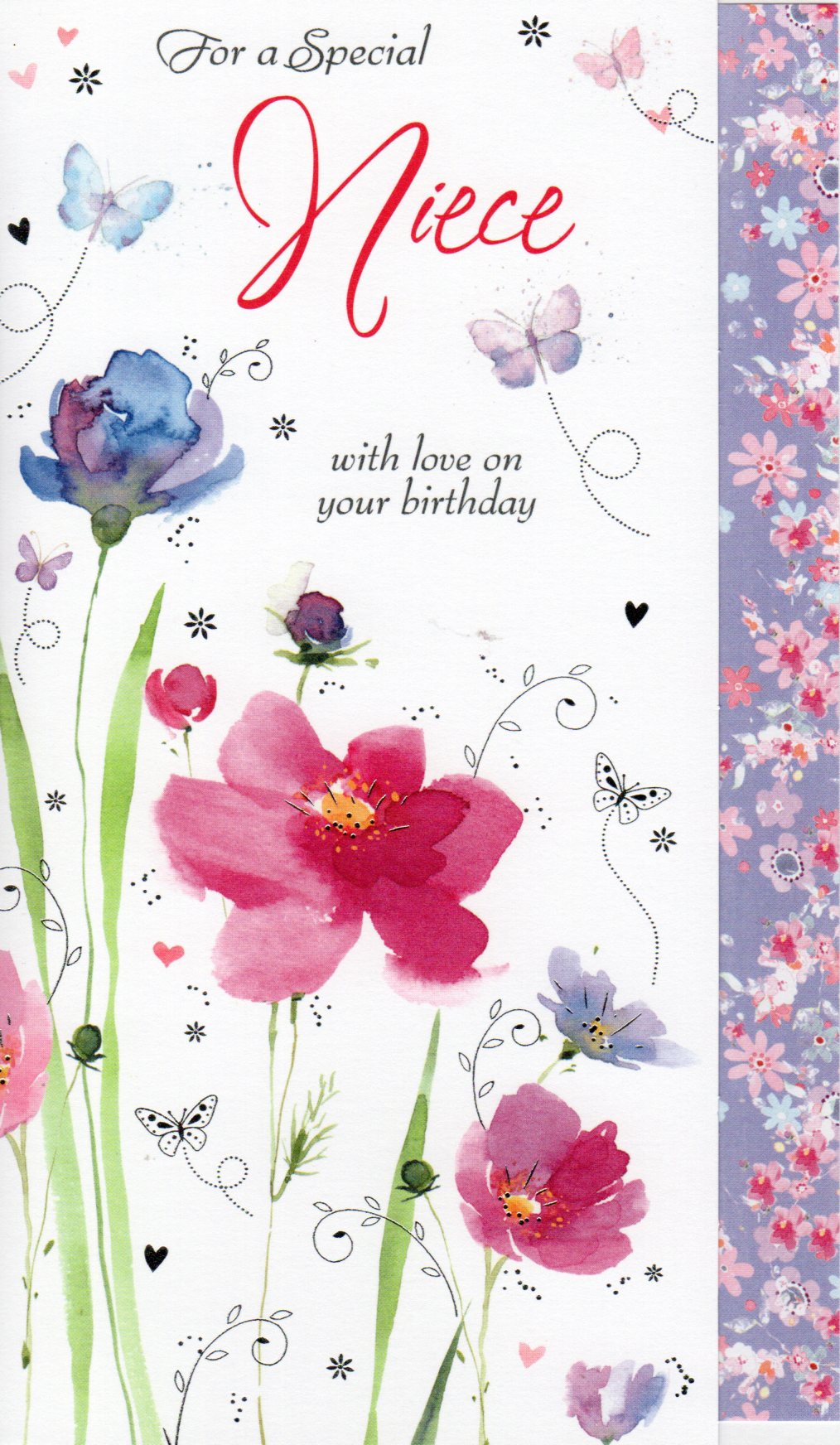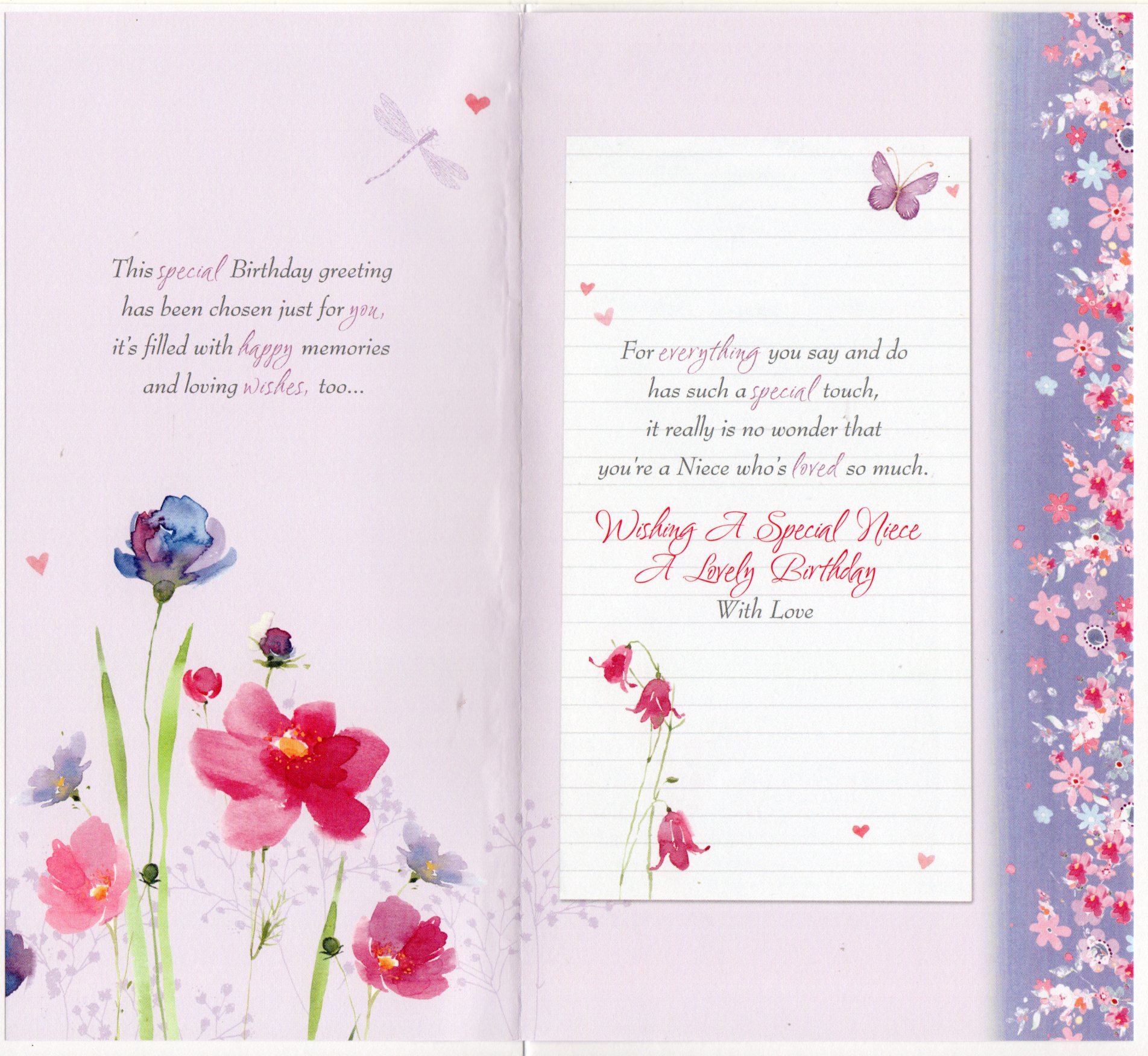 Inside reads: This special Birthday greeting has been chosen just for you, it's filled with happy memories and loving wishes, too..., For everything you say and do has such a special touch, it really is no wonder that you're Niece who's loved so much. Wishing A Special niece A Lovely Birthday With Love