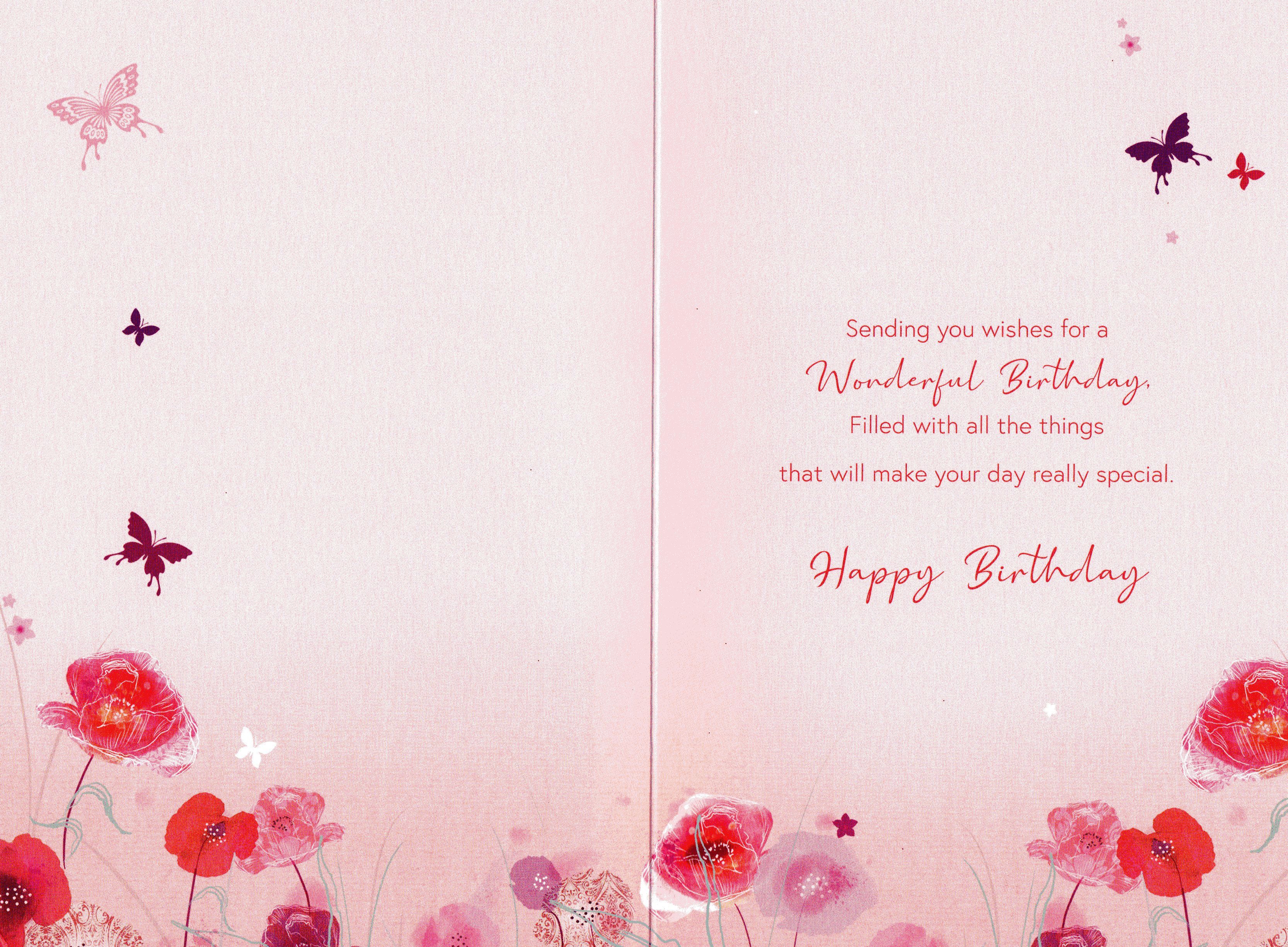 Inside reads: Sending you wishes for a wonderful Birthday filled with all the things that will make your day really special. Happy Birthday