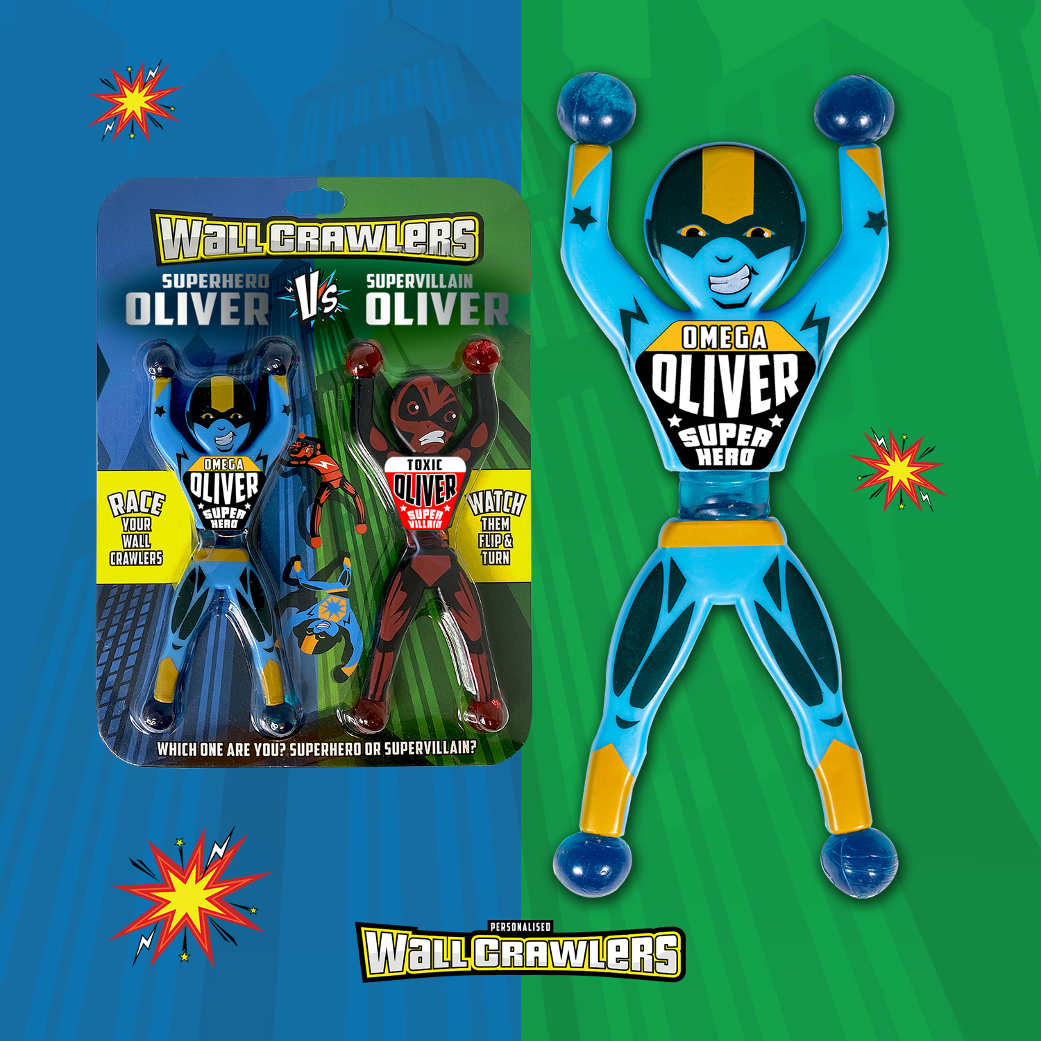 Throw your superhero and supervillain Wall Crawlers at a smooth vertical surface- try a wall, window or even bathroom tiles and see a super race in action!