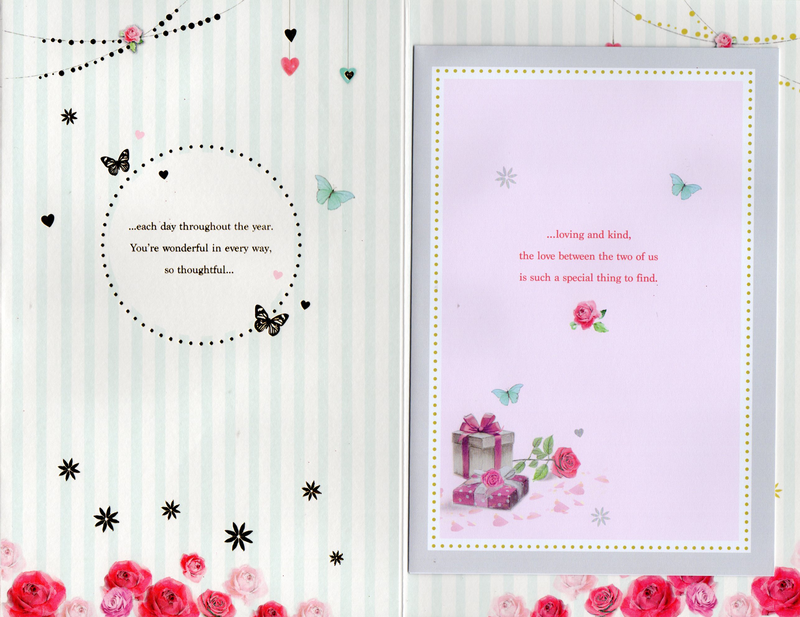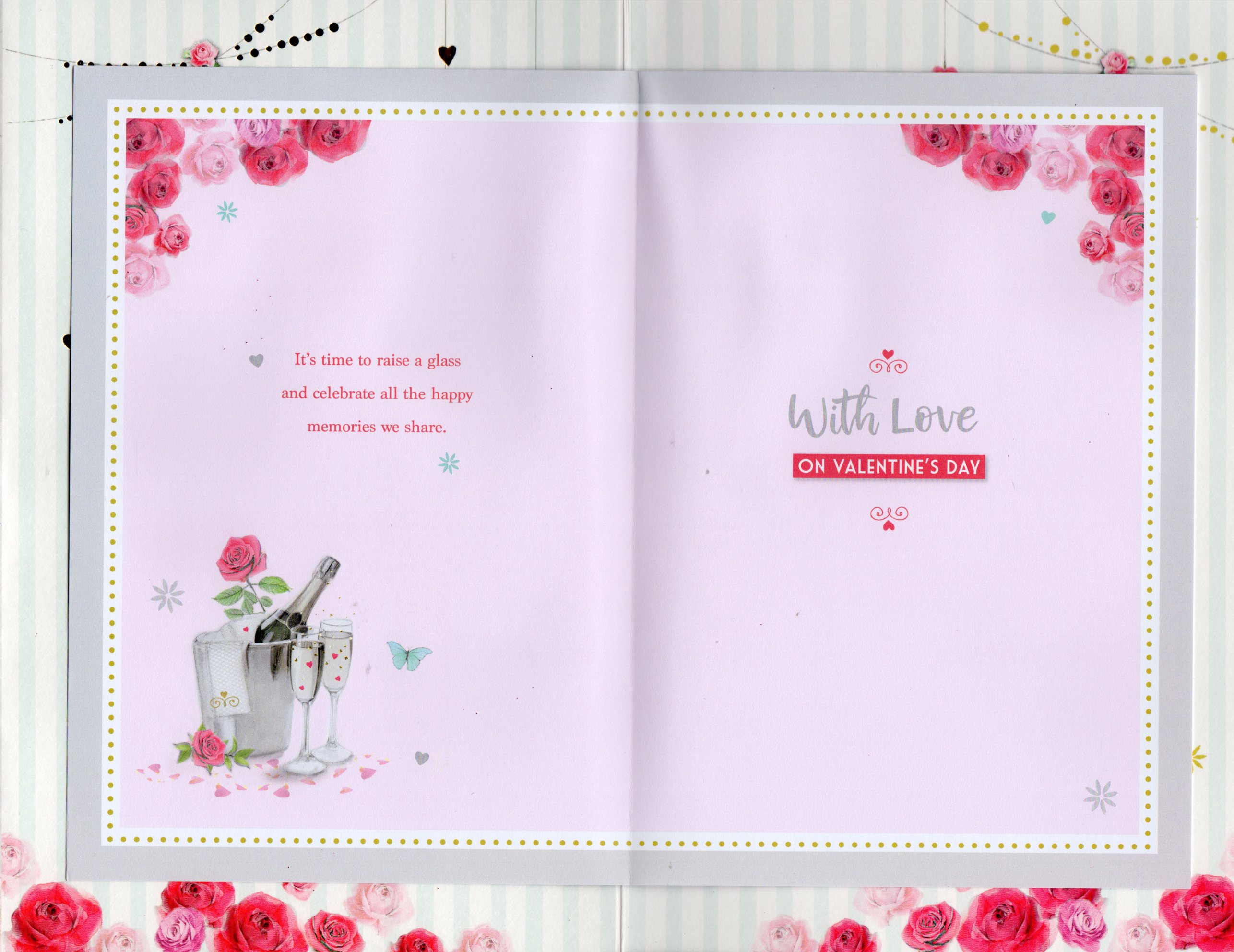 Inside reads: pagel ...each day throughout the year. You're wonderful in every way, so thoughtful... pagell ...loving and kind, the love between the two of us is such a special thing to find. pagelll It's time to raise a glass and celebrate all the happy memories we share. With Love On Valentine's Day