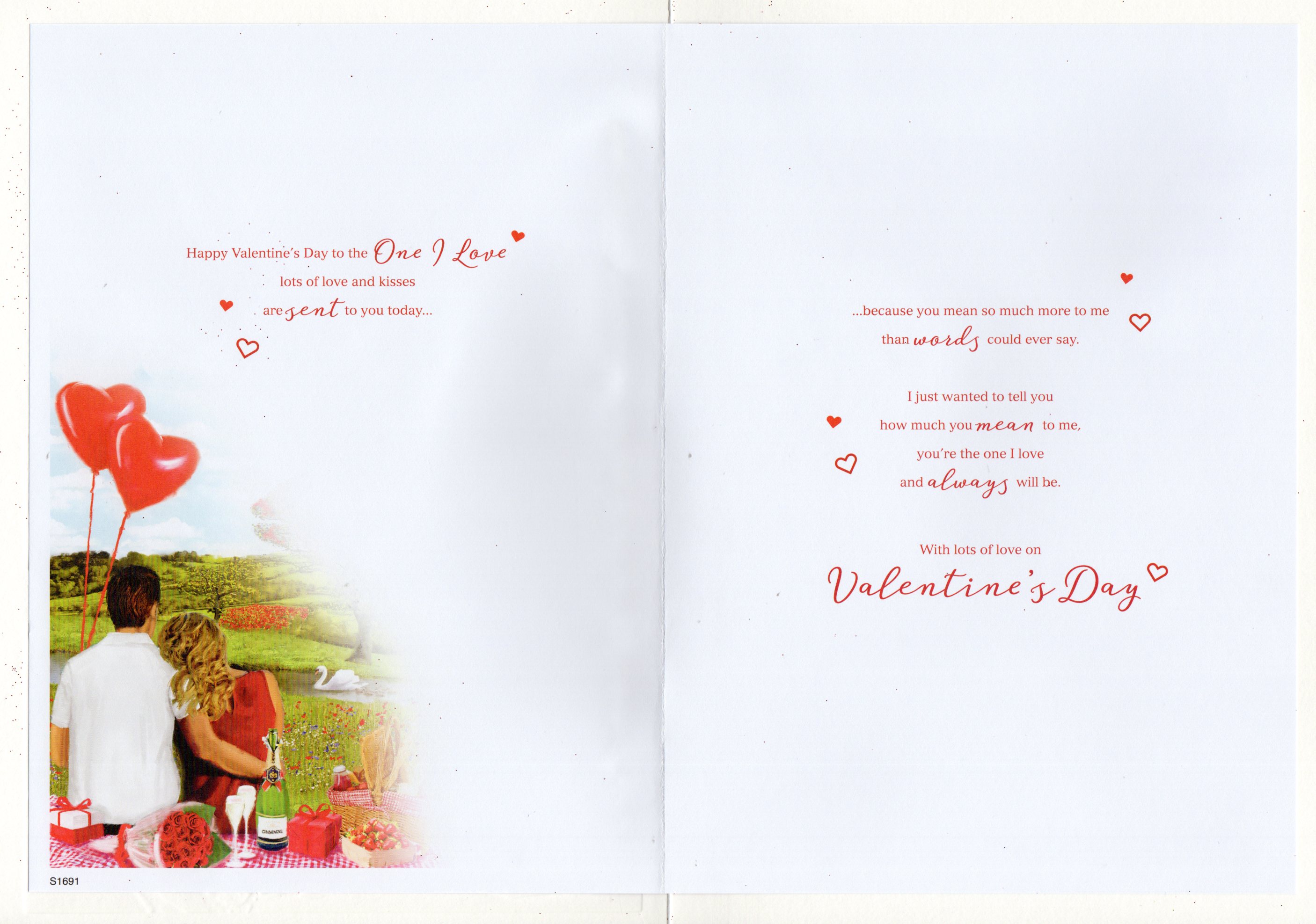 Inside reads: Happy Valentine's Day to the One I Love lots of love and kisses are sent to you today..., ...because you mean so much more to me than words could ever say. I just wanted to tell you how much you men to me, you're the one I love and always will be. With lots of love on Valentine's Day