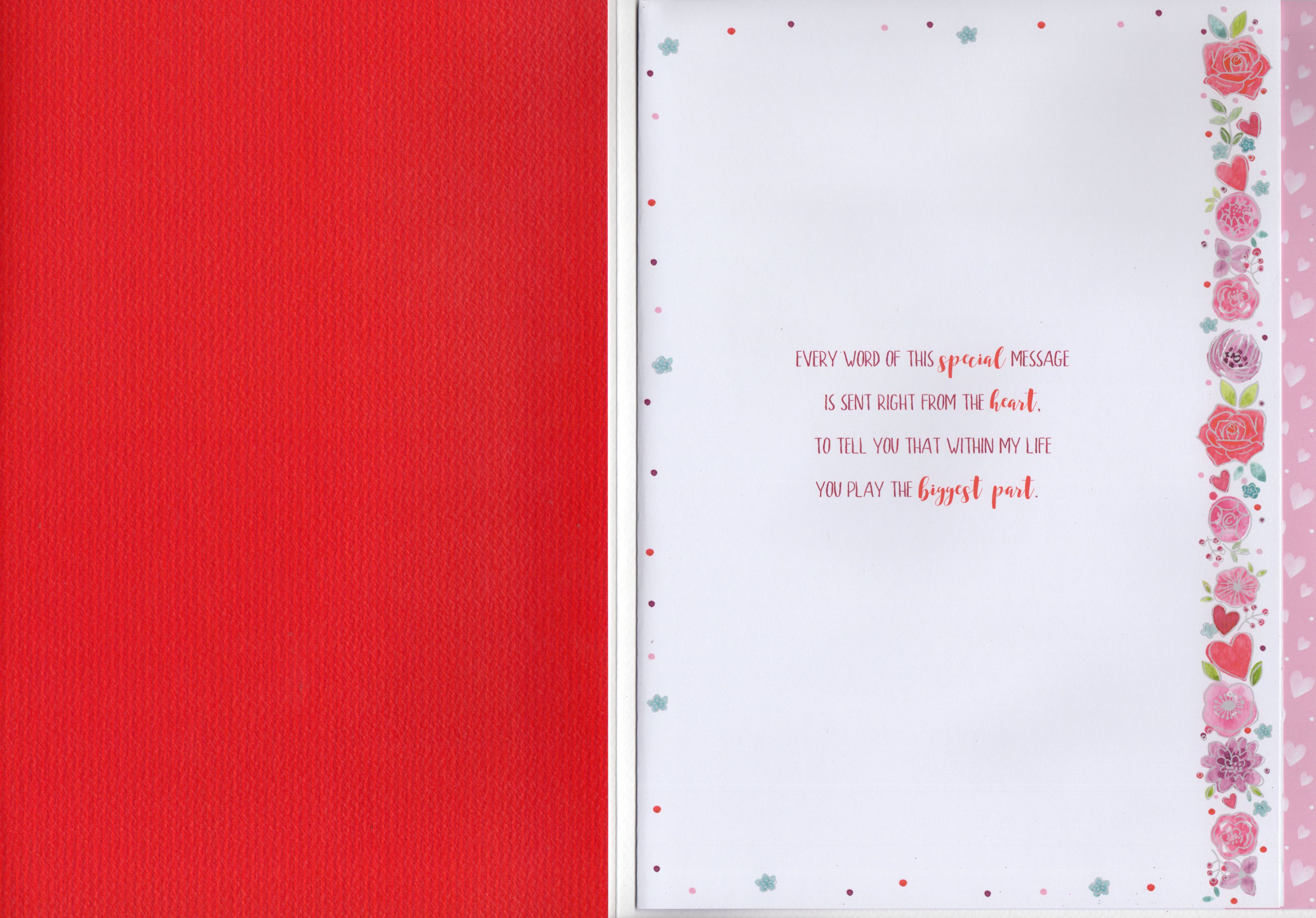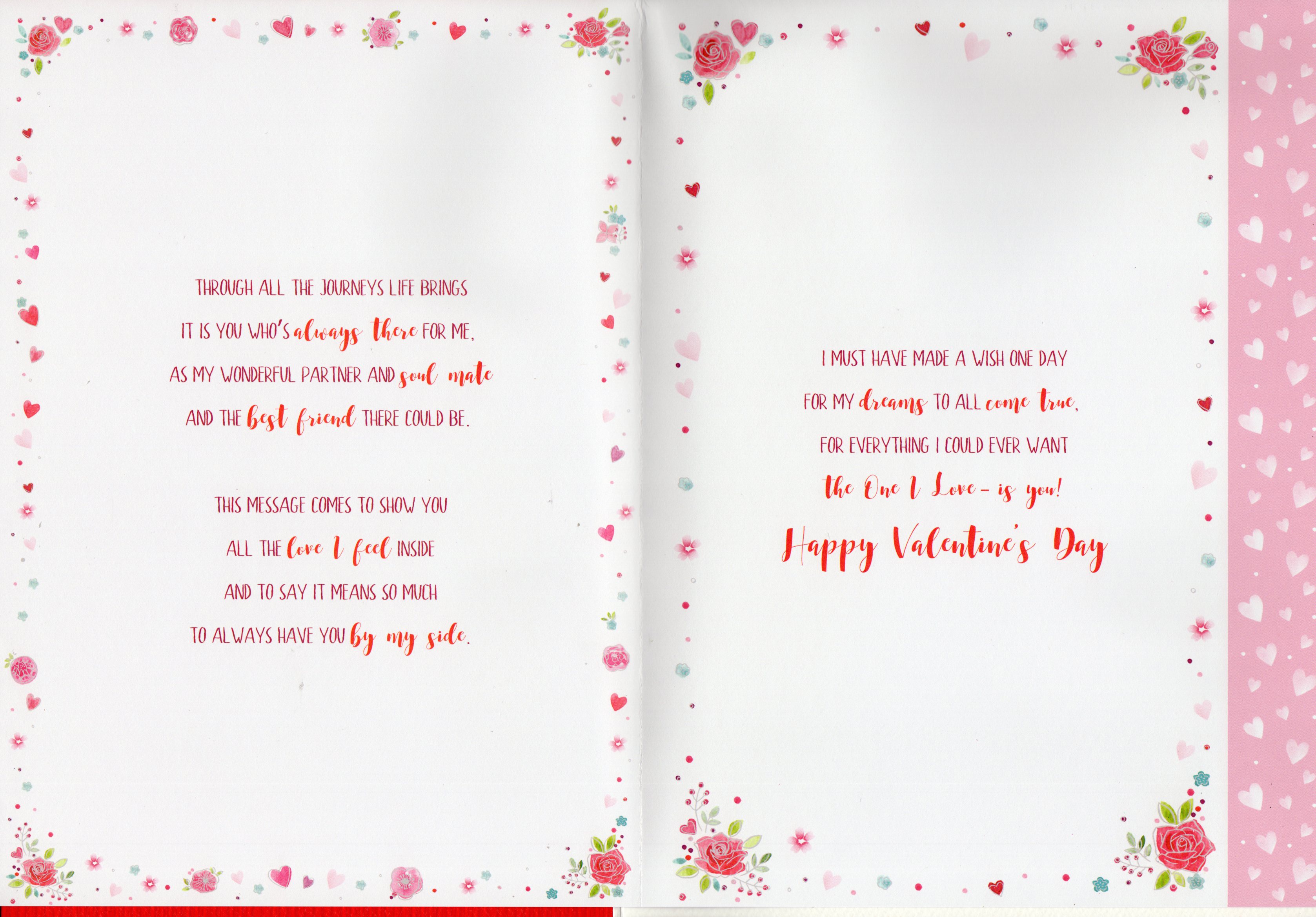 Inside reads: page l Every word of this special message is sent right from the heart, to tell you that within my life you play the biggest part. page ll through all the journeys life brings it is you who's always there for me, as my wonderful partner and soul mate and the best friend there could be. This message come to show you all the love I feel inside and to say it means so much to al ways have you by my side. page lll I must have made A wish one day for my dreams to all come true, for everything I could ever want the One I Love is you! Happy Valentine's Day