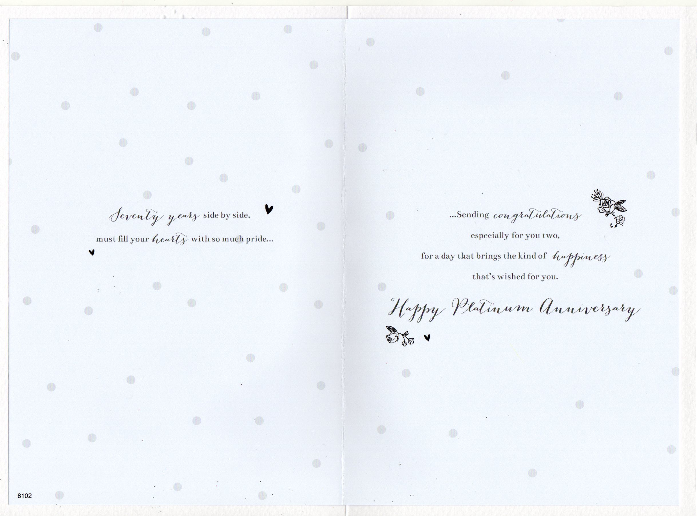 Inside reads: Seventy years side by side,must fill hearts with so much pride..., ...Sending congratulations especially for you two, for a day that brings the kind of happiness that's wished for you. Happy platinum anniversary.