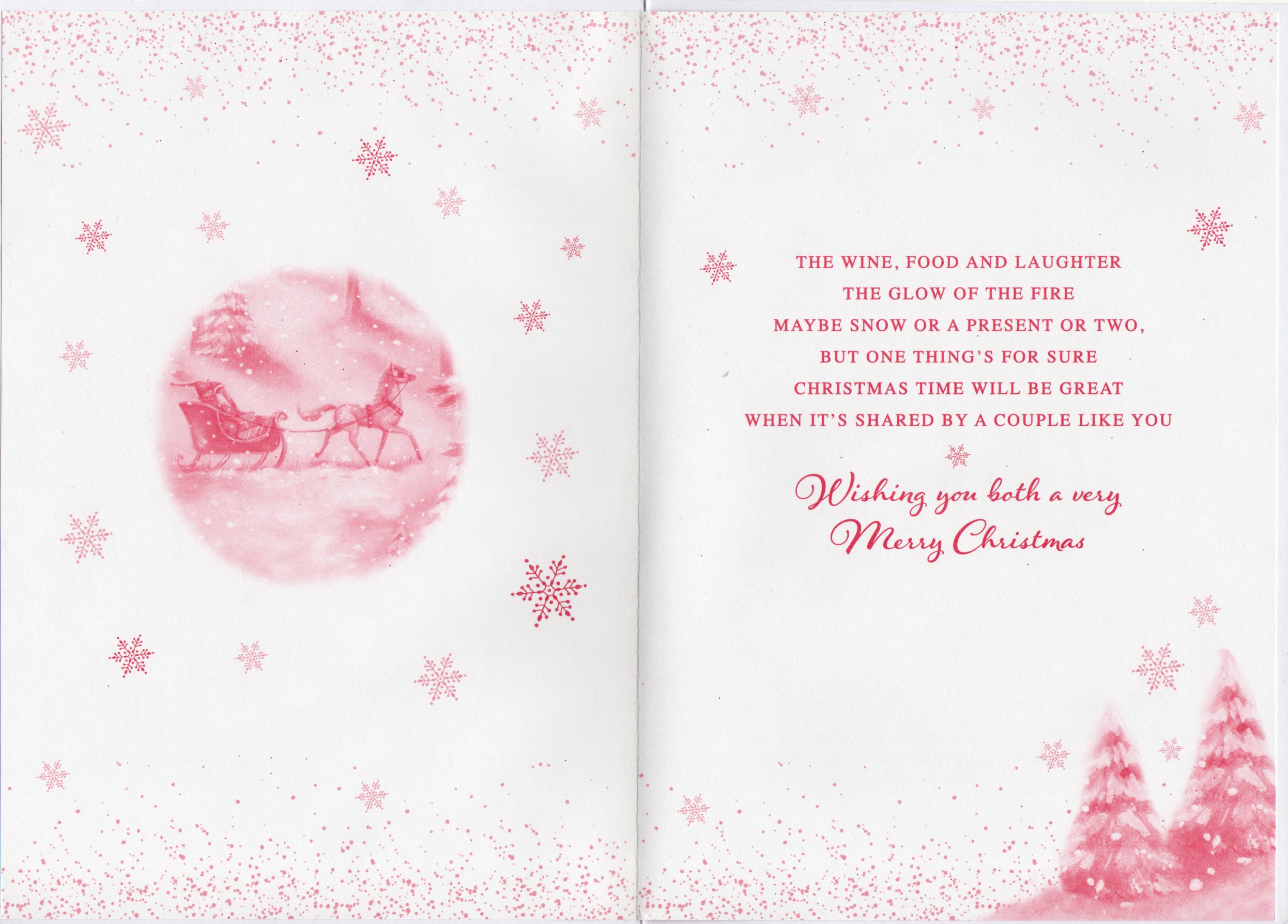 Inside reads: The wine, food and laughter the glow of the fire maybe snow or A present or two, but one thing's for sure Christmas time will be great when it's shared by A couple like you Wishing you both a very Merry Christmas